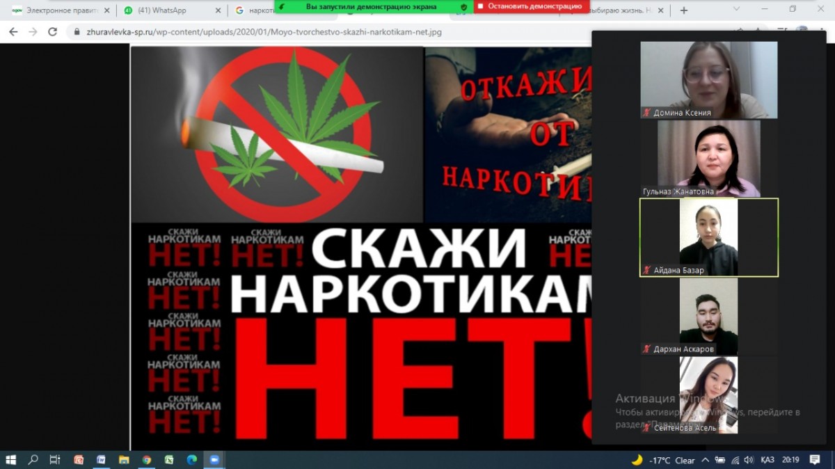 16 марта 2022 года куратор кафедры педагогики Рахимжанова Г.Ж. провела в формате ZOOM кураторский час на тему: «Наркотики – проблема ХХІ века» для студентов академической группы ПП-21-01 (образовательная программа 6В01102 – Педагогика и психология). Цель мероприятия – формирование культуры поведения, направленного на борьбу с вредными привычками, изменение негативной позиции в отношении людей, страдающих наркоманией.