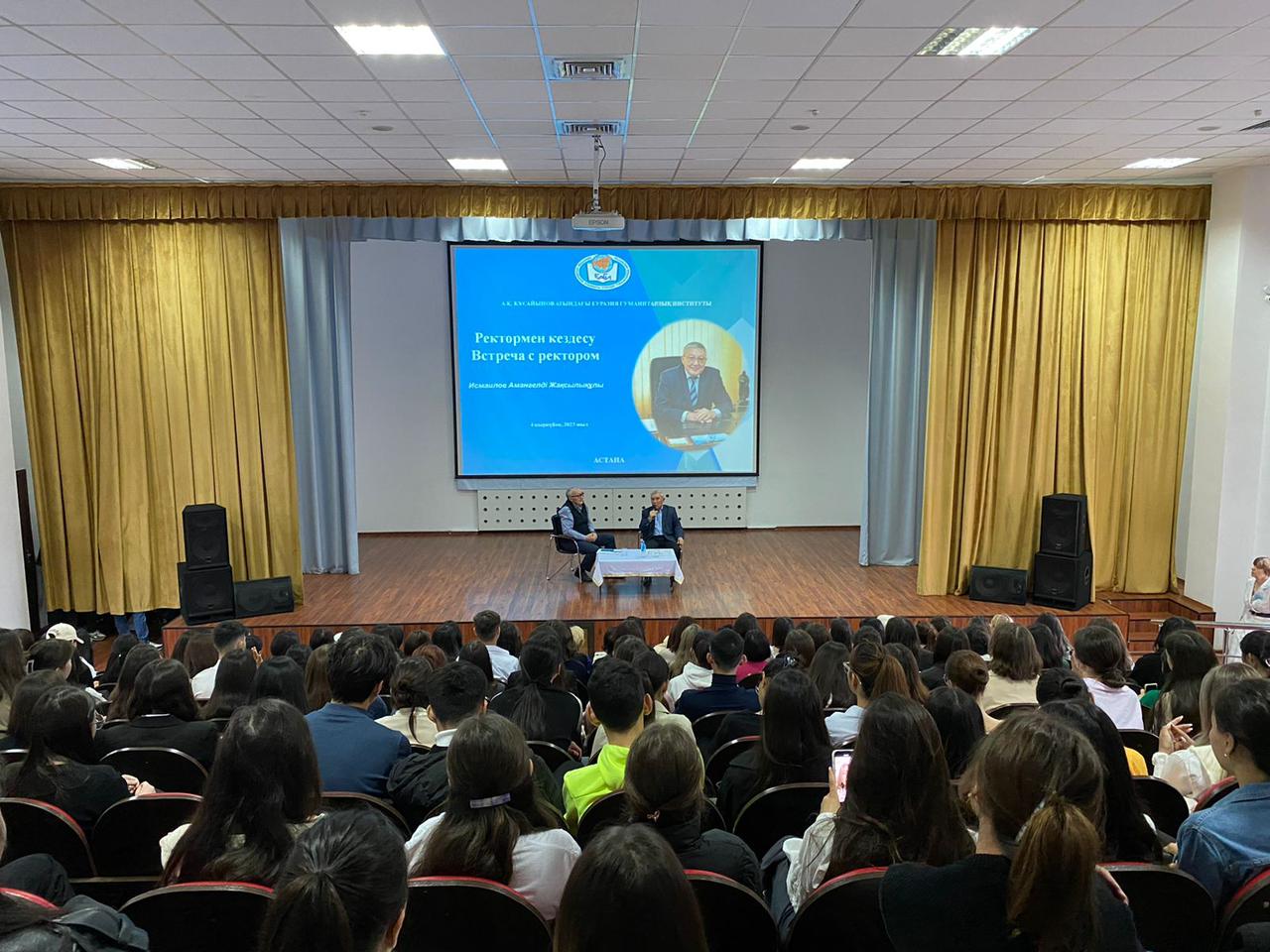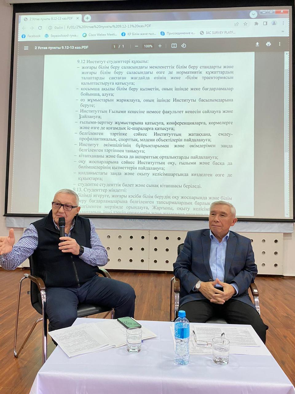 Встречу продолжил проректор института по учебной и научной работе, доктор исторических наук, профессор К. А. Ахметов. Он в своем выступлении основной акцент сделал на ознакомлении первокурсников с Правилами внутреннего распорядка, Уставом ЕАГИ, Кодексом чести студента высшего учебного заведения, Кодексом академической честности, Правилами организации учебного процесса по кредитной технологии.