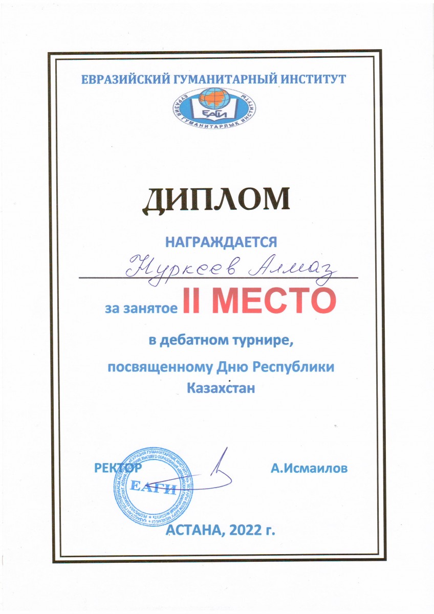 2 место – Нуркеев Алмаз, студент образовательной программы «Финансы» (академическая группа Ф-21-01);