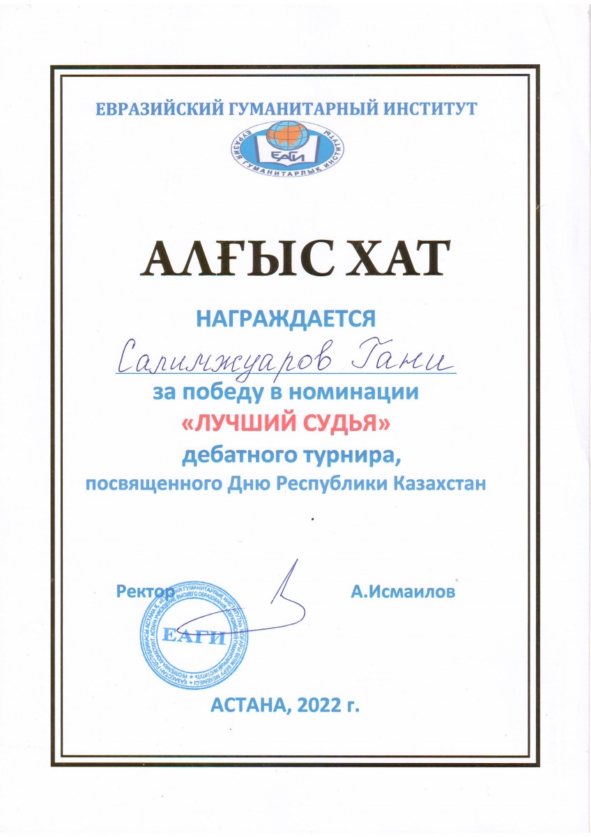 В формате «Линкольн-Дуглас» был определен лучший судья турнира, которым стал студент образовательной программы Юриспруденция» Салимжуаров Гани (академическая группа ЮР-20-01).