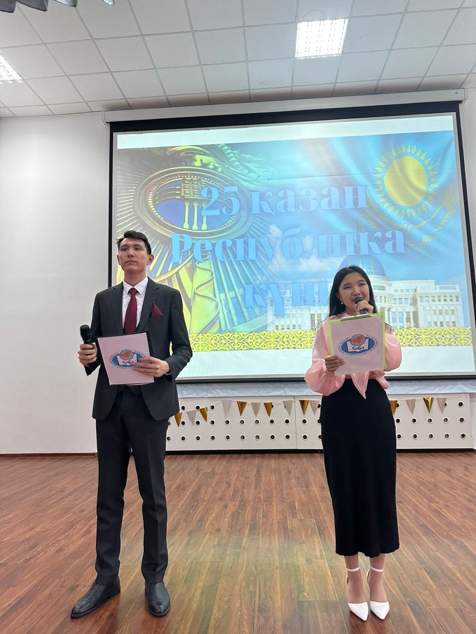 Программа праздничного мероприятия началась со звучания Государственного Гимна страны и поздравительных выступлений ректора, к.психол.н., профессора Исмаилова А. Д. и проректора по учебной и научной работе, д.и.н., профессора К.А. Ахметова, которые отметили неоспоримую важность празднования Дня Республики. С докладом об историческом значении праздника и его влиянии на развитие казахстанской государственности выступил к.и.н., профессор Ескалиев С. А.