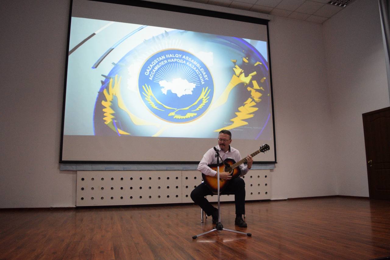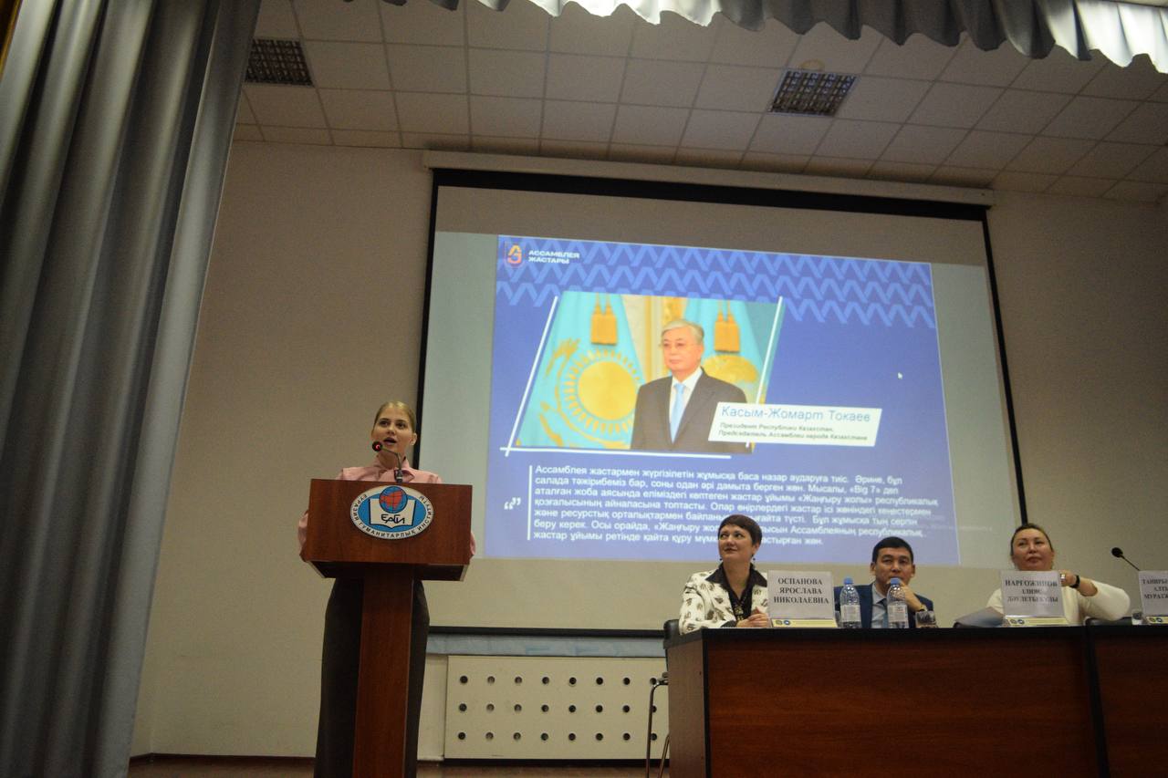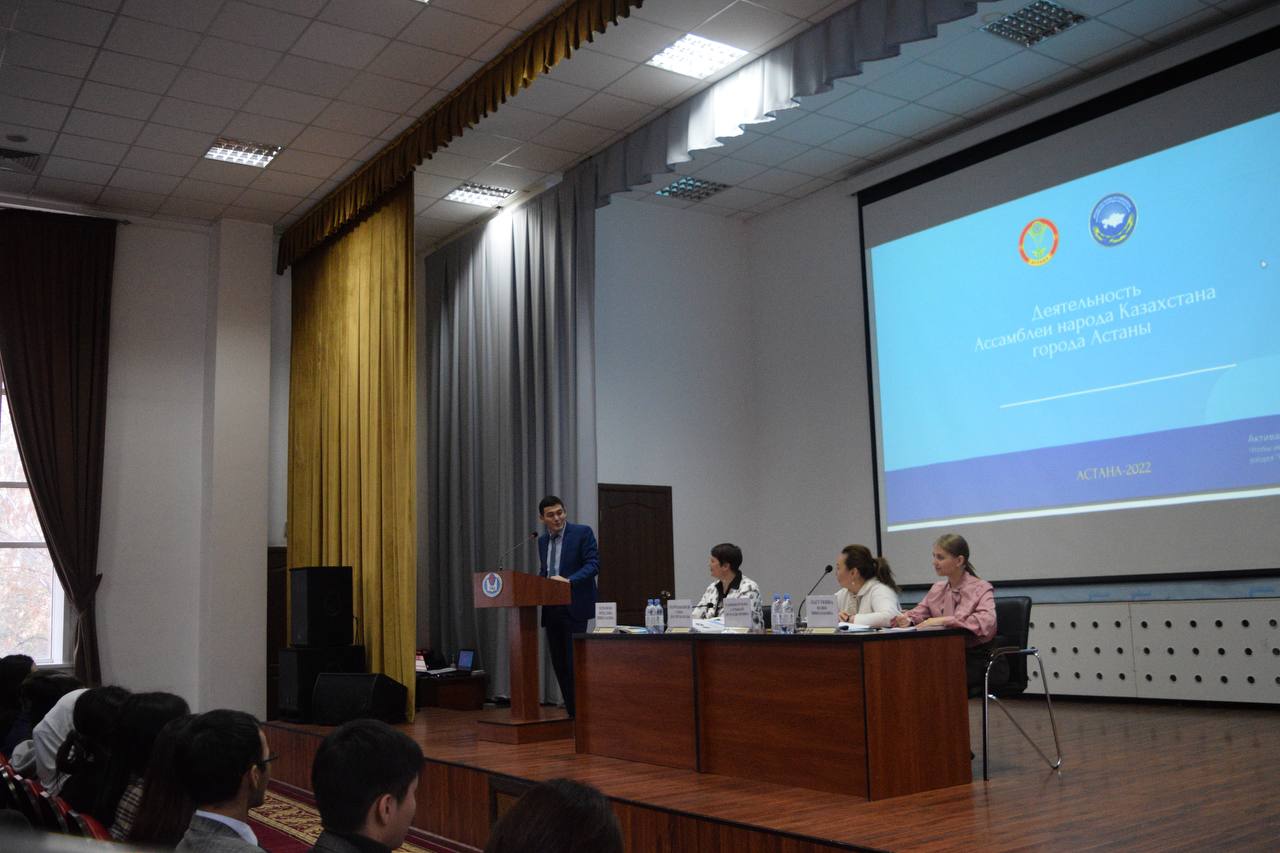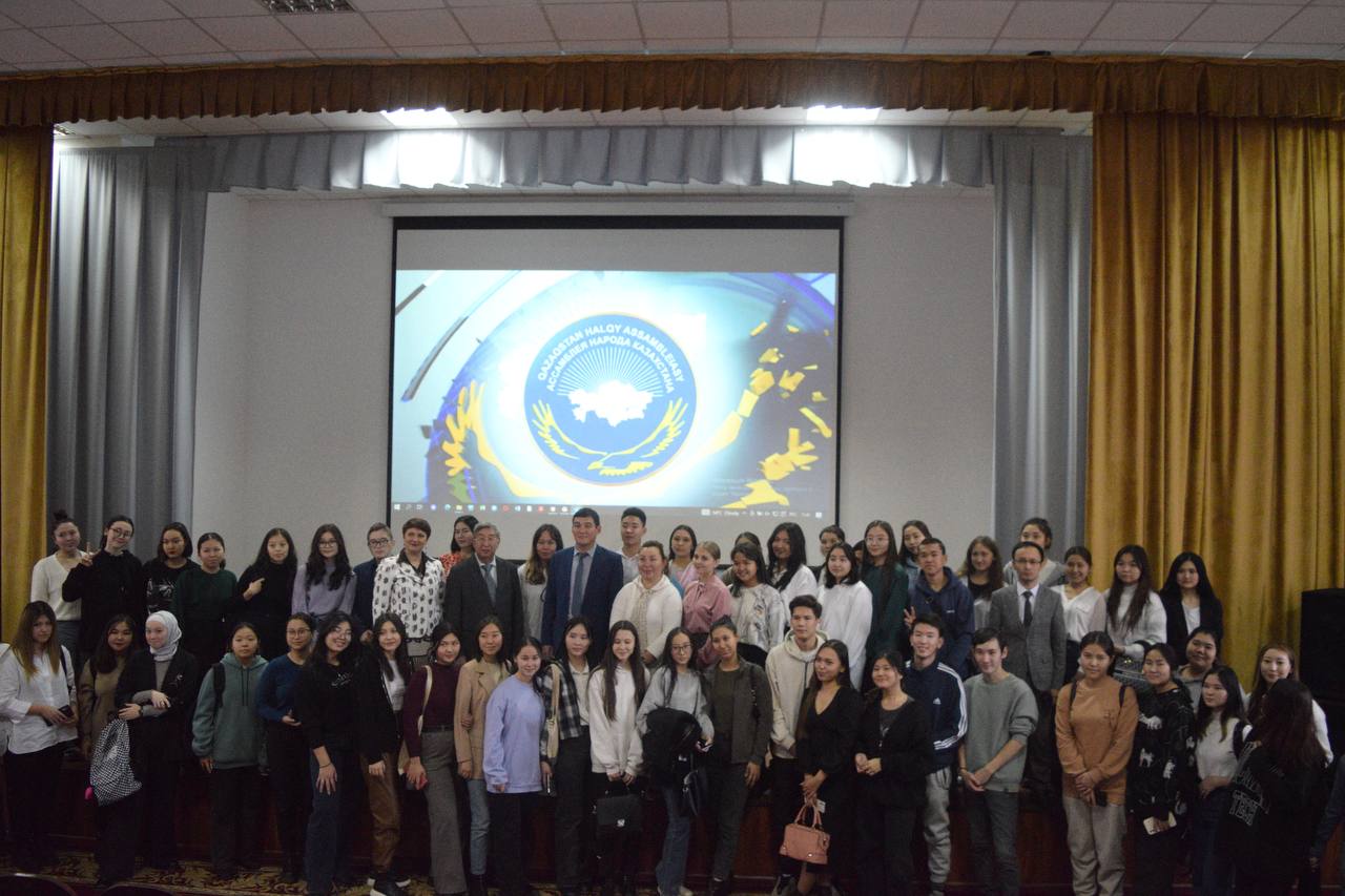 Мероприятие началось с выставки, посвященной деятельности Ассамблеи народа Казахстана, с демонстрацией тематических роликов. Всех участников встречи приветствовала проректор по воспитательной работе ЕАГИ, к.п.н., профессор Оспанова Я.Н., которая в своей вступительной речи подчеркнула особую важность и значимость незыблемых во все времена ценностей: мир, единство и толерантность.
