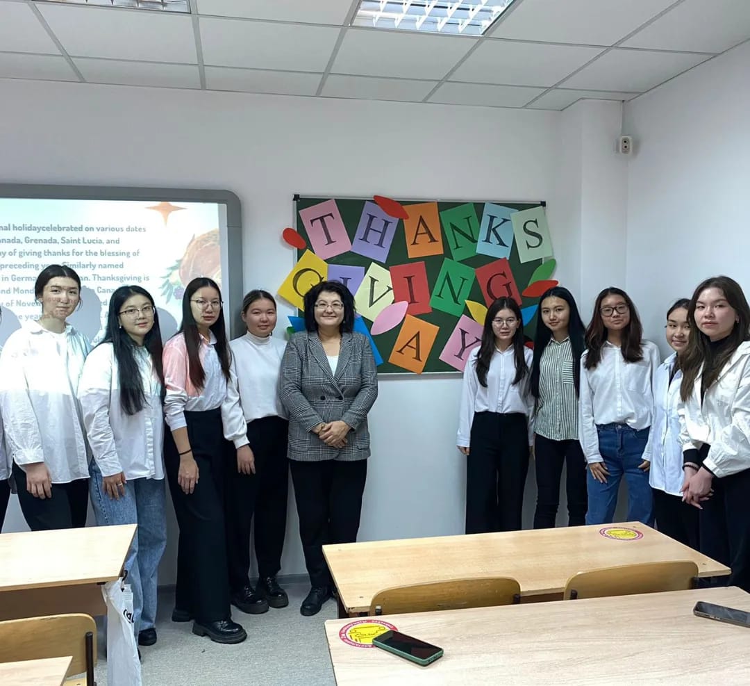 16 ноября 2022 года м.п.н., старший преподаватель кафедры иностранных языков Сарсенова А. М. провела тематическое занятие для студентов 1 курса образовательной программы «Иностранный язык: два иностранных языка» (академическая группа ШТ-22-01), посвященное знакомству с национальными традициями стран изучаемого языка. В ходе занятия студенты рассмотрели традиции и историю возникновения праздника «День Благодарения». Занятие прошло в интерактивной форме, все студенты приняли в нем активное участие.