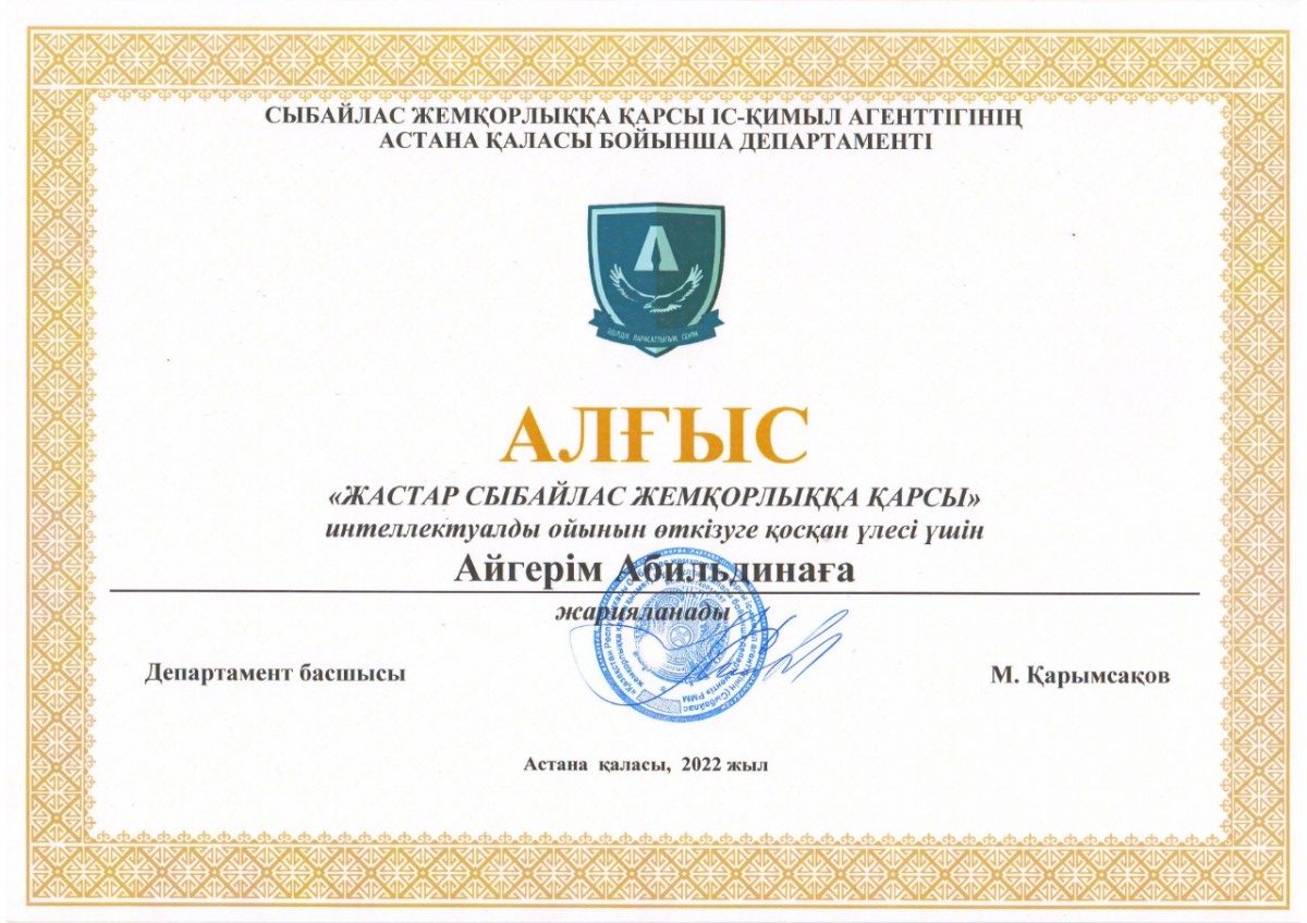Всем победителям и призерам, а также организаторам интеллектуальной игры – председателю КДМ, Президенту Студенческого Парламента Абильдиной Айгерим (академическая группа ЮК-19-01) и председателю студенческого антикоррупционного клуба «Саналы Ұрпақ» Салимжуарову Гани (академическая группа ЮР-20-01) были вручены грамоты, благодарственные письма Департамента Агентства Республики Казахстан по противодействию коррупции по г.Астане и призы Управления по противодействию наркопреступности Департамента полиции г. Астаны.