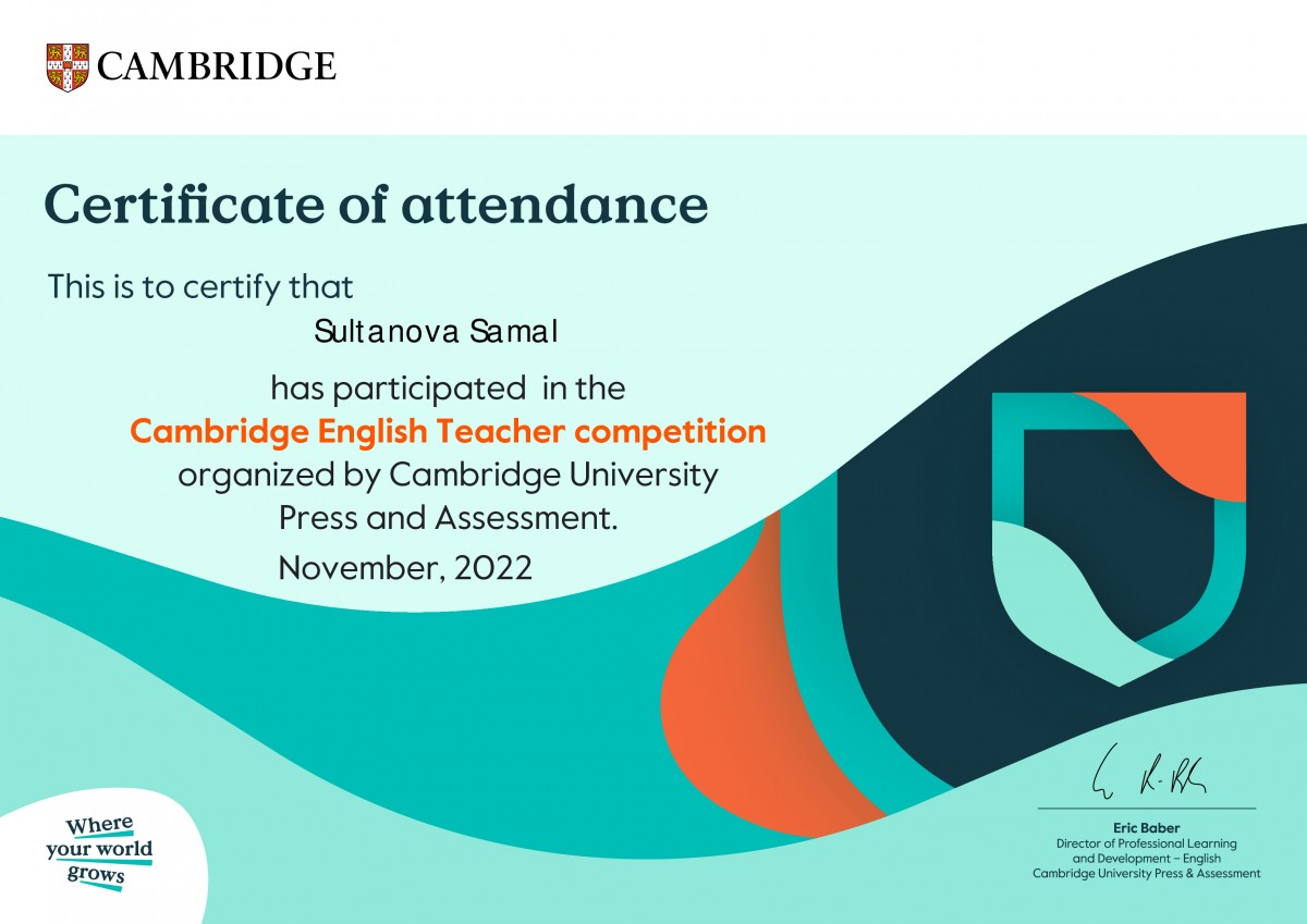 В течение ноября 2022 года преподаватели кафедры иностранных языков Аренова Г.У., Сарсенова А.М., Султанова С.М. и Давлетова С.Е. участвовали в конкурсе Cambridge English Teacher, организованном Cambridge University Press and Assessment.