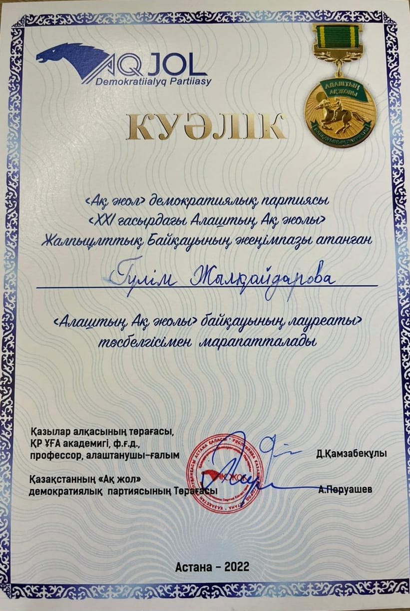 В общенациональном конкурсе «Светлый путь Алаш в 21 веке» приняли участие молодые ученые из всех вузов Казахстана, исследователи Кыргызской Республики, а также наши соотечественники в странах дальнего зарубежья в возрасте от 18 до 35 лет. Конкурс состоял из трех этапов. Студентка 4 курса образовательной программы 6В01606 – «История» Жылкайдарова Г. (научный руководитель: к.и.н., профессор Евразийского гуманитарного института им А.К. Кусаинова С.А. Ескалиев), принимавшая участие в заключительном туре национального конкурса, проходившего в г.Астане 13 декабря, заняла 1 место. Жилкайдарова Г. награждена дипломом I степени, свидетельством, значком лауреата «Светлый Путь Алаша в XXI в.» и денежной премией.