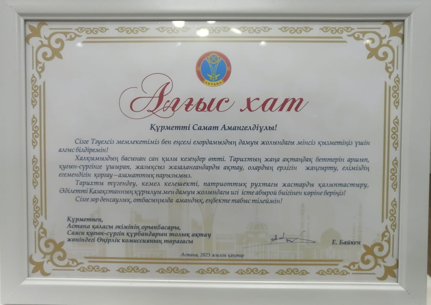 9 января в здании «Дома Дружбы» на мероприятии, организованном акиматом города Астаны, состоялась презентация сборника документов и материалов «Акмолинский регион в архивных документах (20-40 гг. ХХ в.)», составленная членами региональной комиссии. Член региональной комиссии по городу Астане и Акмолинской области, профессор Евразийского гуманитарного института им. А. К. Кусаинова Ескалиев С.А. был поощрен благодарственным письмом.