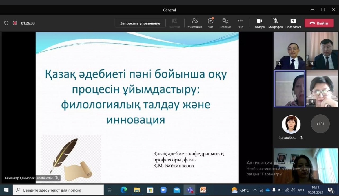 10 января 2023 года в вебинаре «Анализ эффективности применения инновационных методов и технологий в учебном процессе университета», организованном филологическим факультетом Евразийского национального университета имени Л.Н. Гумилева, в качестве работодателя принял участие заведующий кафедрой казахской и русской филологии, доктор философии (PhD), доцент Алимбаев А. Е., который, участвуя в дискуссии, поделился мнением об организации учебного процесса в вузе.