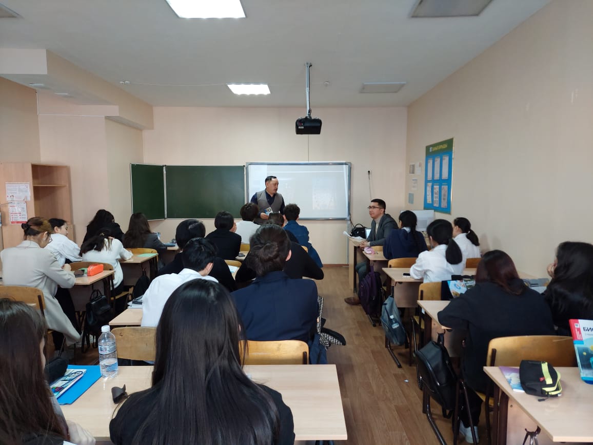 19 января 2023 года старшие преподаватели кафедры экономических и математических дисциплин Баймамыров Б.А. и Дәулетханова Ж.Д. провели профориентационное мероприятие с участием учителей и учащихся выпускных классов школы-лицей №59.