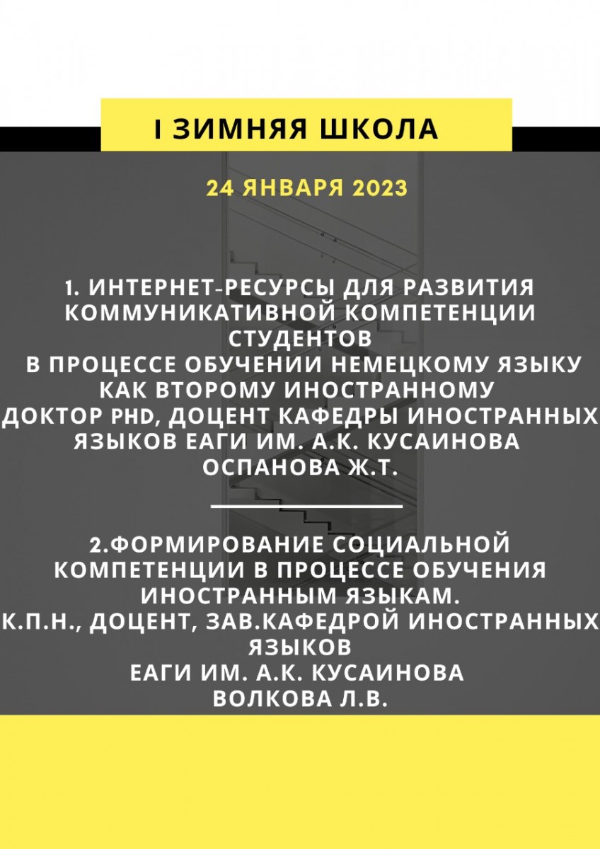 Лекторами в Зимней школе выступили: к.п.н., доцент, заведующая кафедрой иностранных языков ЕАГИ имени А.К. Кусаинова Волкова Л.В.; д.п.н., профессор Казахского Аграрно-технического университета им. С. Сейфуллина Галиев Т.Т.; доктор PhD, доцент кафедры иностранных языков ЕАГИ им. А.К. Кусаинова Оспанова Ж.Т.; MA in TESOL North Eastern Illinois University, Chicago IL August Garnsey (USA); к.ф.н., учитель английского языка авторской экспериментальной школы ( г. Омск, Россия) Матиенко О.П.; Associated Professor Dr. Kursat Cesur (Turkey); PhD, Associated Professor of Nazarbayev University Tajik Mir Afzal (Pakistan); к.п.н., доцент кафедры иностранных языков филологического факультета ЕНУ им. Л.Н. Гумилева Тусупбекова М.Ж.