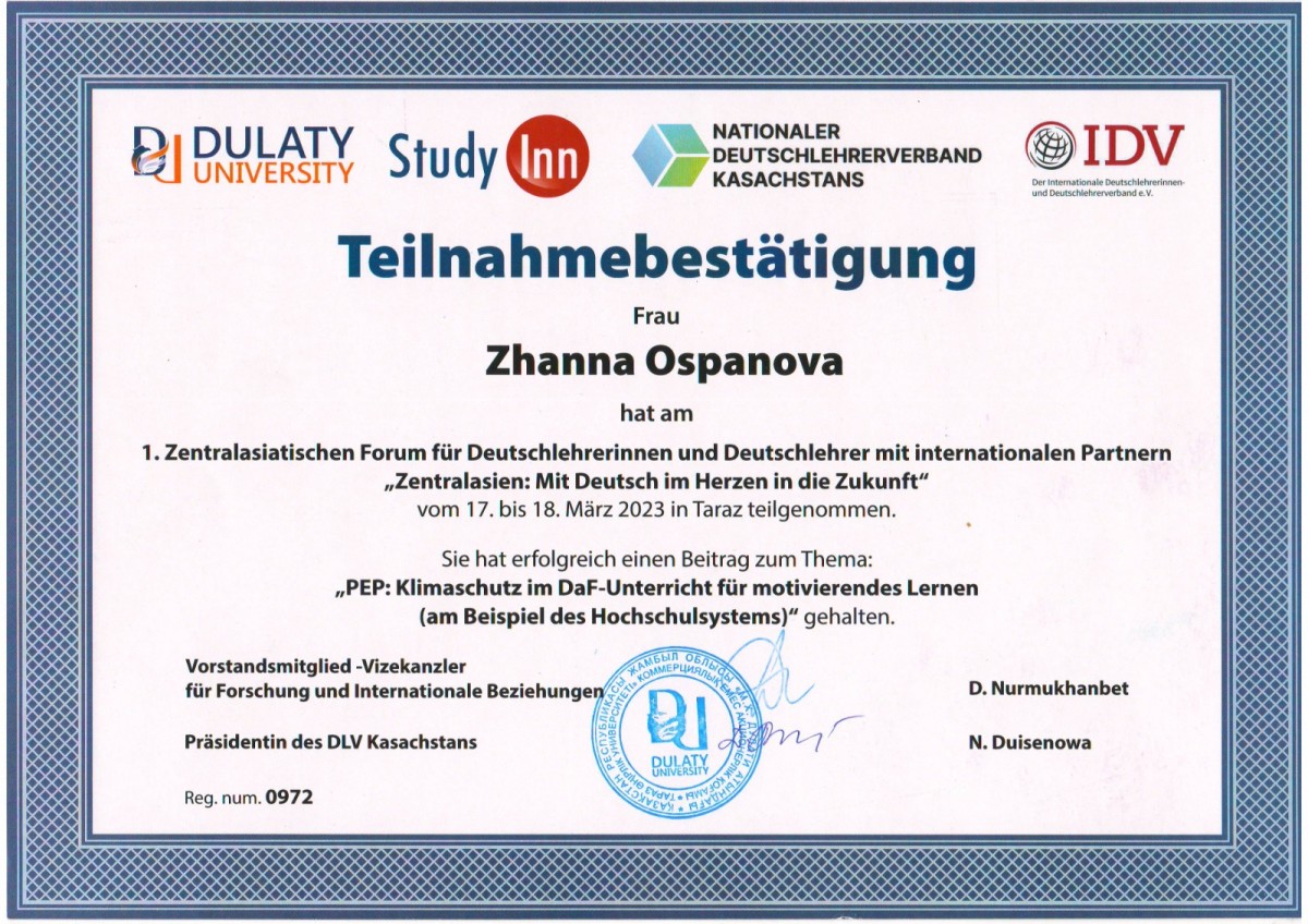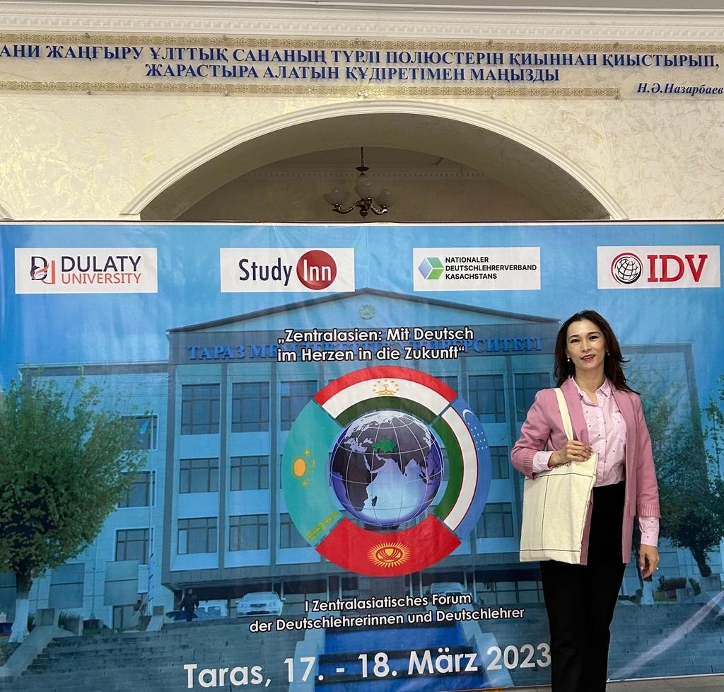 17-18 марта 2023 года в Таразском региональном университете имени М. Х. Дулати прошел Первый Центрально-Азиатский Форум учителей немецкого языка “Zentralasien: mit Deutsch im Herzen in die Zukunft” с участием международных партнеров. PhD, доцент кафедры иностранных языков ЕАГИ Оспанова Ж.Т. приняла активное участие в данном научном мероприятии и выступила с докладом на тему: «PEP: Klimaschutz im DaF für motivierdes Lernen im Hochschulsystem». Доклад был подготовлен в экологическо-лингводидактическом направлении, работа по которому ведется Оспановой Ж.Т. в течение учебного года в рамках научного проекта ИРН AP14869631 «Модель «зеленая школа – зеленый колледж – зеленый университет» как система развития экологизации образования». В рамках форума прошли мастер-классы, состоялся обмен опытом по методике преподавания немецкого языка в школах, колледжах и вузах Германии, Казахстана, Кыргызстана, Узбекистана и Таджикистана.
