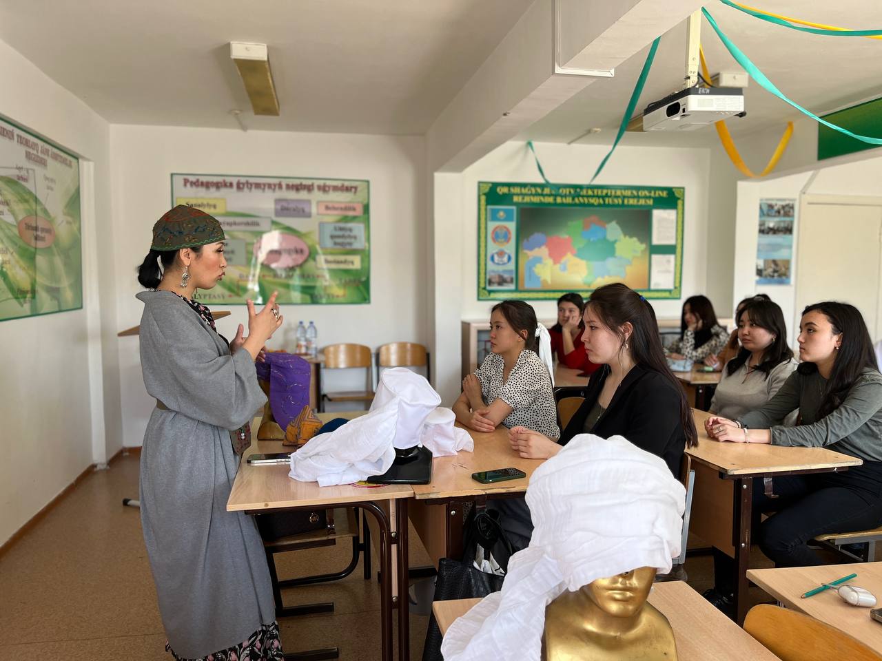 28 апреля 2023 года доцент кафедры педагогики И.А. Тобагабылова и старший преподаватель кафедры А.Т. Балтабаева организовали мастер-класс с социальным предпринимателем, этнодизайнером Мадиной Куандык, в котором приняли участие студенты 1 курса образовательной программы «Педагогика и методика начального обучения» (академическая группа БО –22-01). В рамках мастер-класса Мадина Куандык представила авторский проект «Капсырма». Участники мероприятия получили информацию об особенностях изготовления национальных головных уборов, а именно: кимешека, такии.