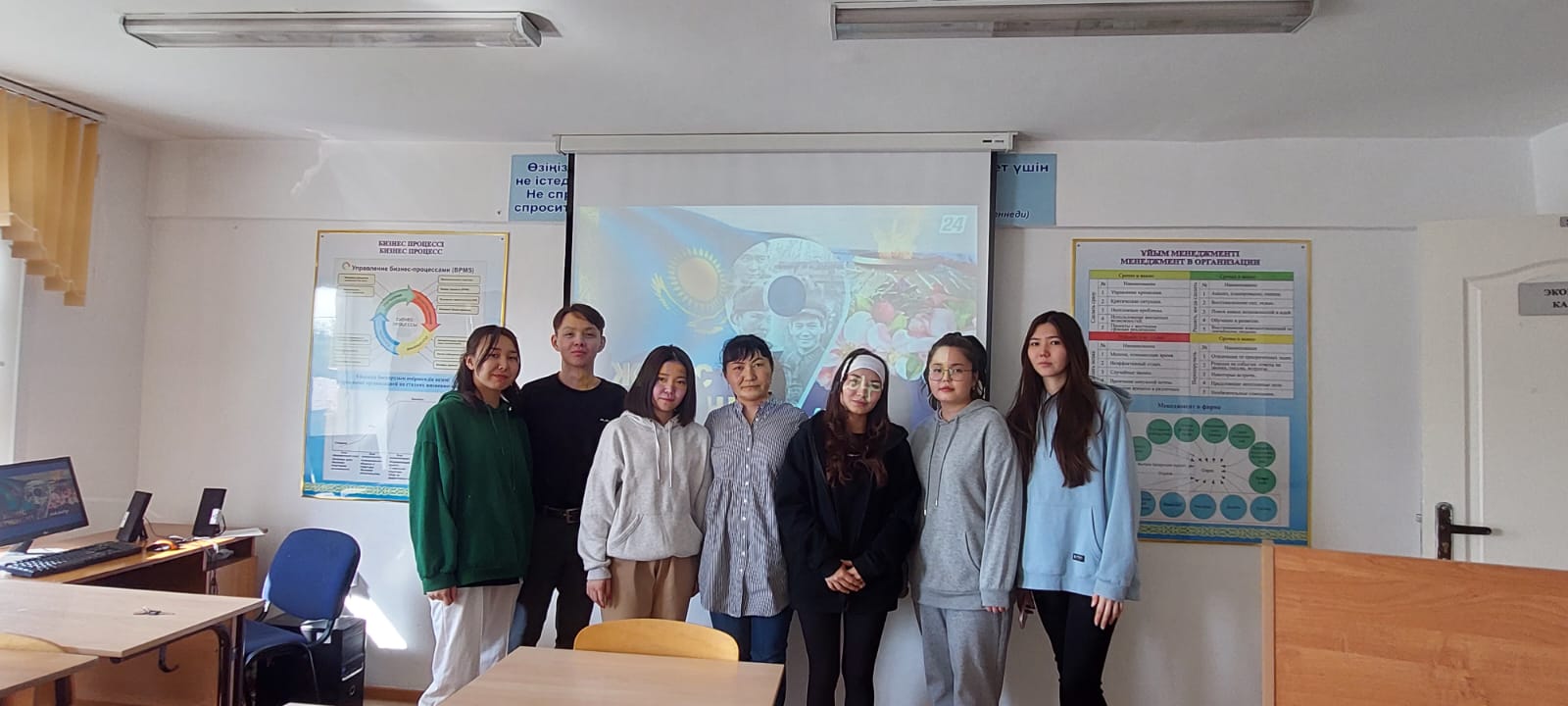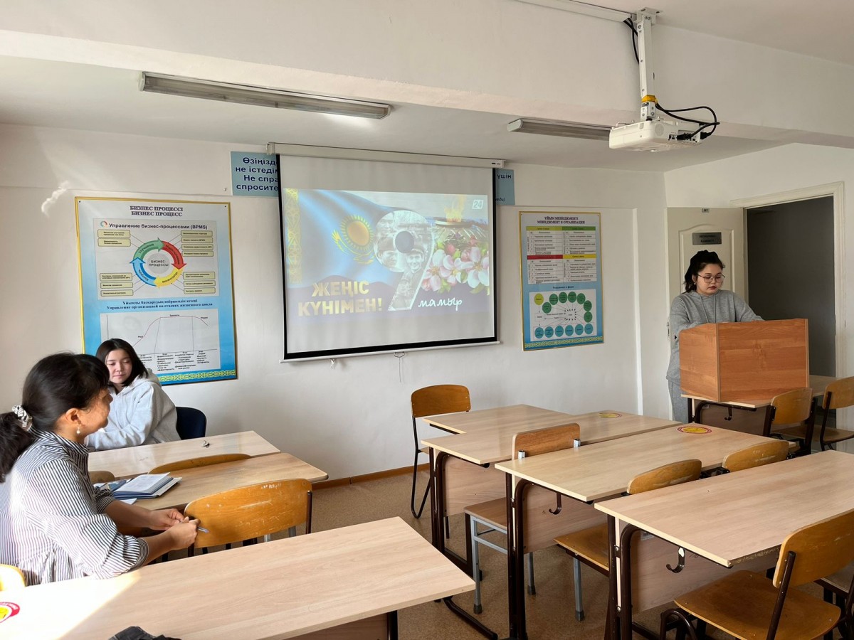 11 мая 2023 года куратор кафедры экономических и математических дисциплин Дәулетханова Ж.Д. в рамках празднования  Дня Победы провела кураторский час «Ер мен жердің жеңісі»  для студентов академической группы  К-21-01 (2 курс, образовательная программа «Финансы»). Цель мероприятия: побудить молодое поколение к изучению истории страны, следуя принципу «никто и ничто не будет забыто», укрепить любовь к Родине, воздать должное героическим подвигам, способствовать укреплению межнациональной дружбы.