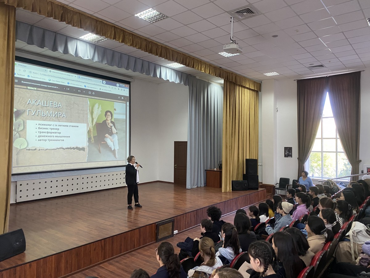 22 сентября 2023 года в Евразийском гуманитарном институте им. А.К. Кусаинова в рамках лектория «Мир и молодежь» кафедра экономических и математических дисциплин организовала гостевую лекцию с участием практикующего коуч-психолога Акашевой Г.К. на тему: «Взаимоотношения между мужчиной и женщиной», слушателями которой стали студенты образовательных программ «Финансы», «Педагогика», «Иностранный язык: два иностранных языка». Цель лекции: подготовка молодого поколения к реалиям семейной жизни, быта и обучение выстраиванию взаимоотношений между членами семьи.