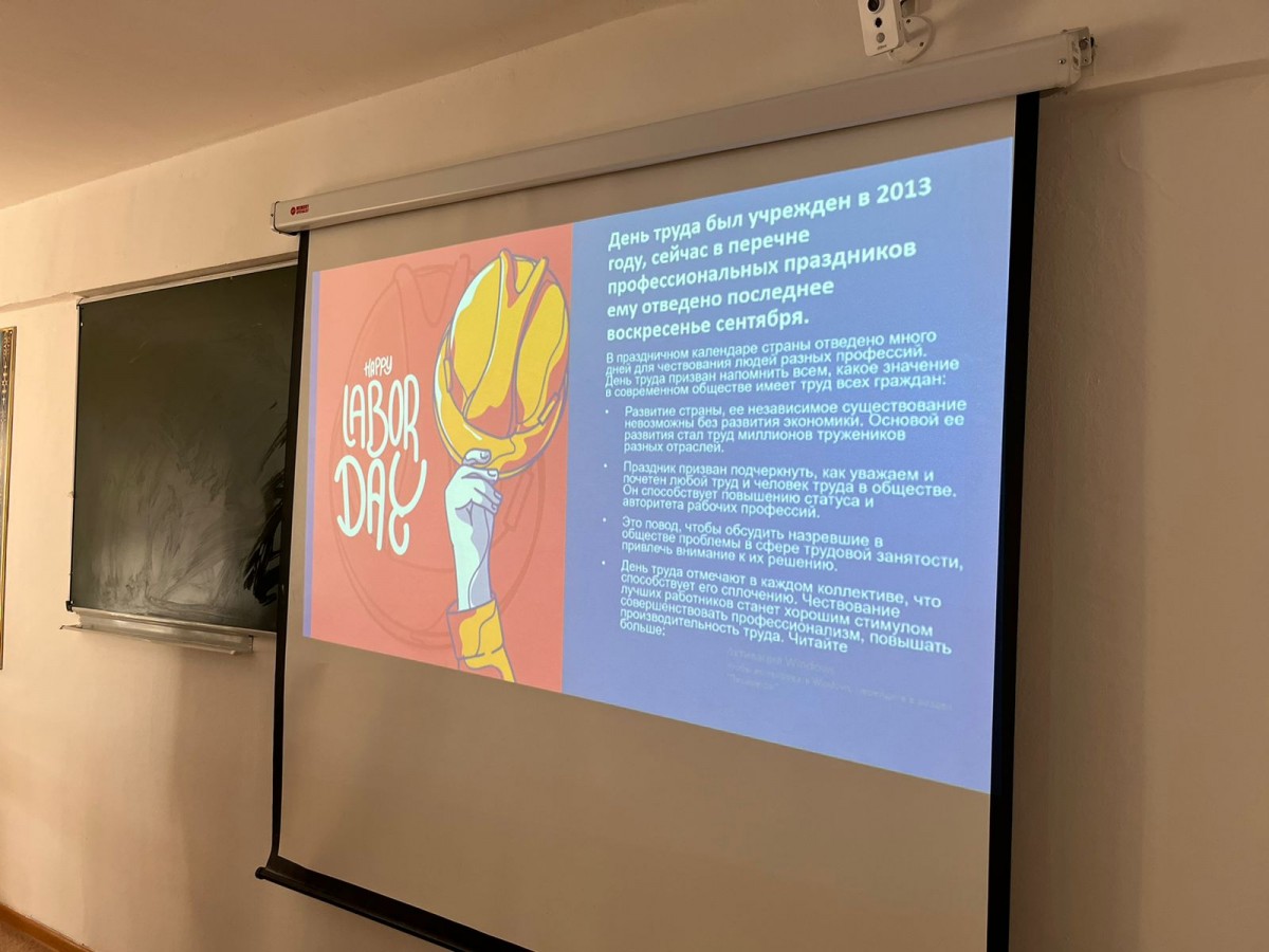 6 октября 2023 года в рамках празднования Дня труда кураторы Абельдинов А.С. и Канафина Г.А. провели кураторский час на тему: «Жизнь без труда – одна пустота!» в академических группах ЮРТ-22-01, ЮР-21-01 (2 – 3 курсы, образовательная программа «Юриспруденция»). Цель мероприятия: расширение представления студентов о значении труда в жизни общества, нацеливание студентов на правильное восприятие учебного труда, формирование положительной нравственной оценки таких качеств человека, как: трудолюбие, самостоятельность, усидчивость.