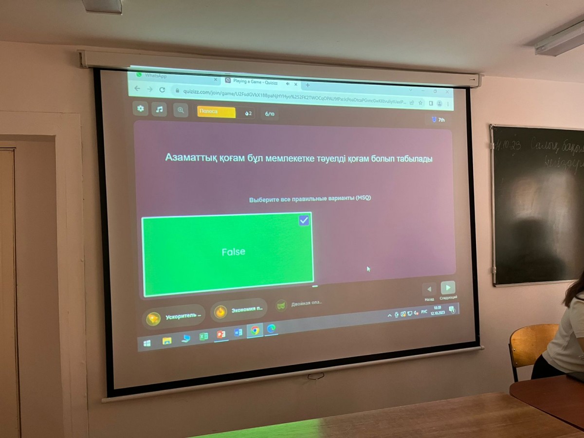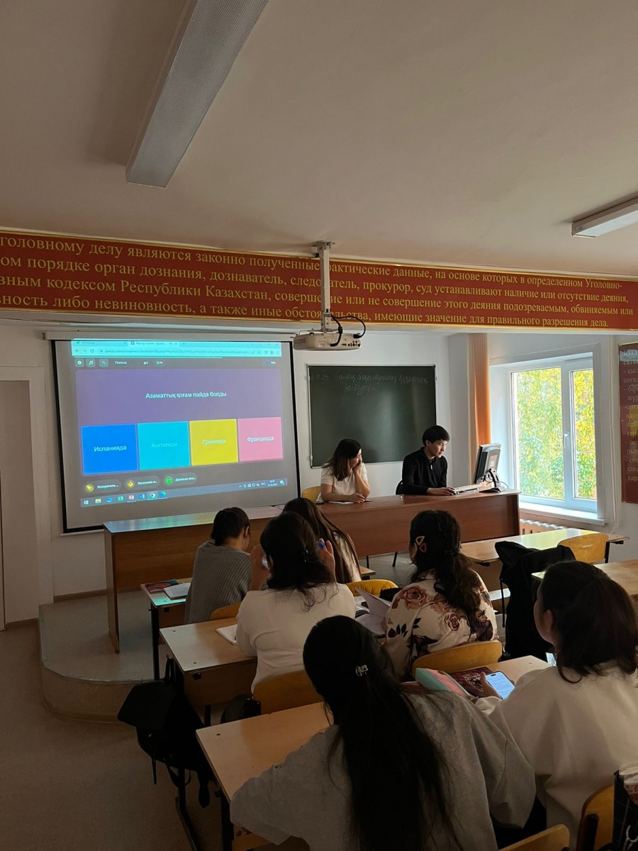 Следуя современным тенденциям широкого распространения цифровых технологий преподаватели кафедры юридических дисциплин активно применяют их в учебном процессе. Так, 12 октября 2023 года старший преподаватель кафедры Тортаева А.Е.  в ходе лекционного занятия по дисциплине «Теория государства и права» в академической группе ЮК-23-01 (1 курс, образовательная программа «Юриспруденция») осуществила проверку степени усвоения полученных знаний студентами с помощью программы Quizizz.