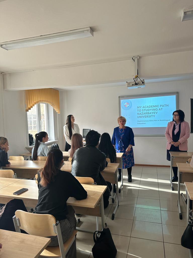 27 октября 2023 года состоялась встреча студентов 1-4 курсов с выпускницей 2022 г. кафедры иностранных языков Шахмановой Алиной, которая в настоящее время обучается в магистратуре Высшей Школы Образования (Назарбаев университет). Алина поделилась своим опытом поступления в Назарбаев Университет и рассказала о том, как написать мотивационное письмо. Встреча прошла в интерактивной форме, студенты получили ответы на все свои вопросы.