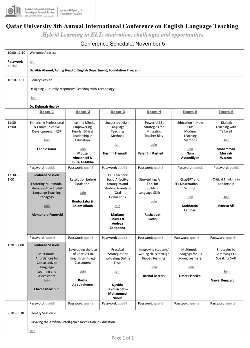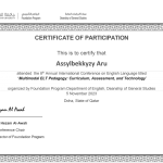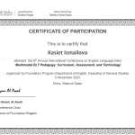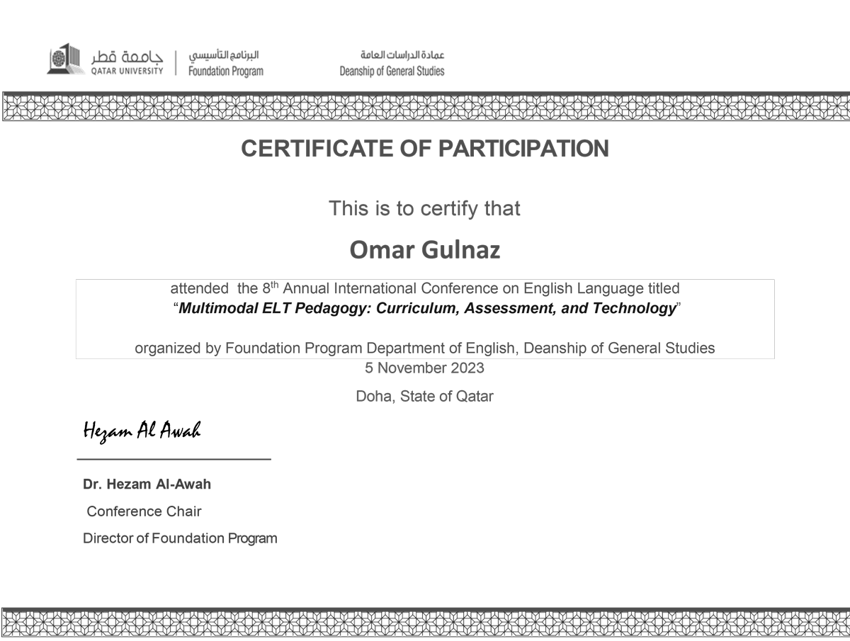 5 ноября 2023 года студенты академической группы ШТ-22-01 (2 курс, образовательная программа «Иностранный язык: два иностранных языка») под руководством старшего преподавателя, м.п.н. Сарсеновой А.М. приняли участие в 8-й ежегодной Международной конференции по английскому языку “Multimodal ELT Pedagogy: Curriculum, Assessment, and Technology”, организованной подготовительной программой факультета английского языка, деканатом общих исследований Катарского университета.