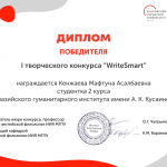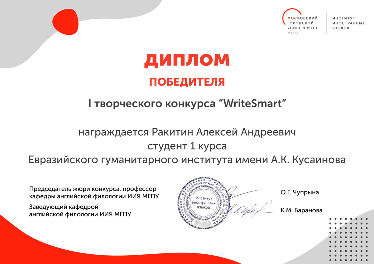 В конкурсе приняли участие 145 студентов, представлявших вузы России, Казахстана и Беларуси. Студенты Евразийского гуманитарного института имени А.К.Кусаинова Кенжаева Мафтуна (2 курс, образовательная программа «Иностранный язык: два иностранных языка») и Ракитин Алексей (1 курс, образовательная программа «Иностранный язык: два иностранных языка») стали победителями конкурса (научный руководитель: м.п.н, старший преподаватель Сарсенова А.М).
