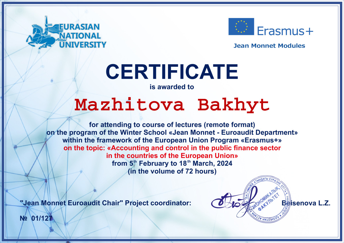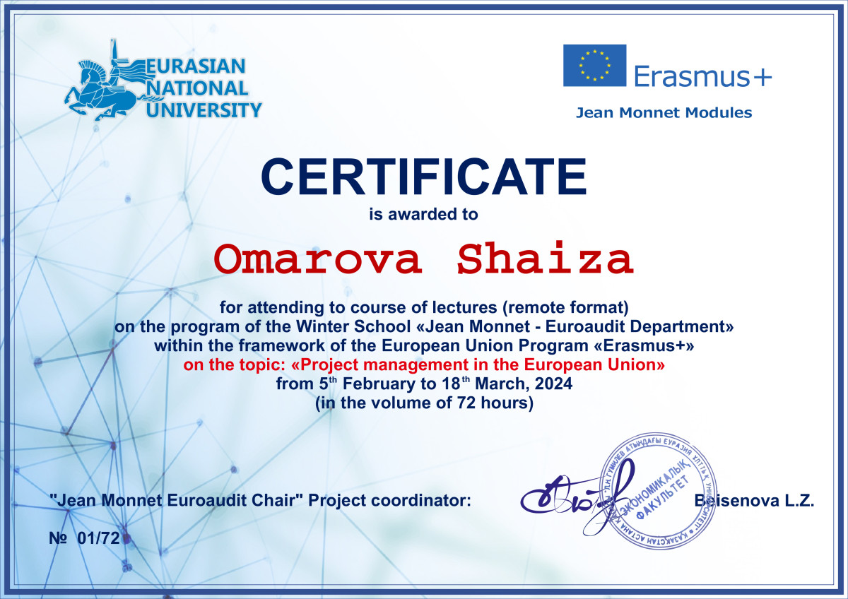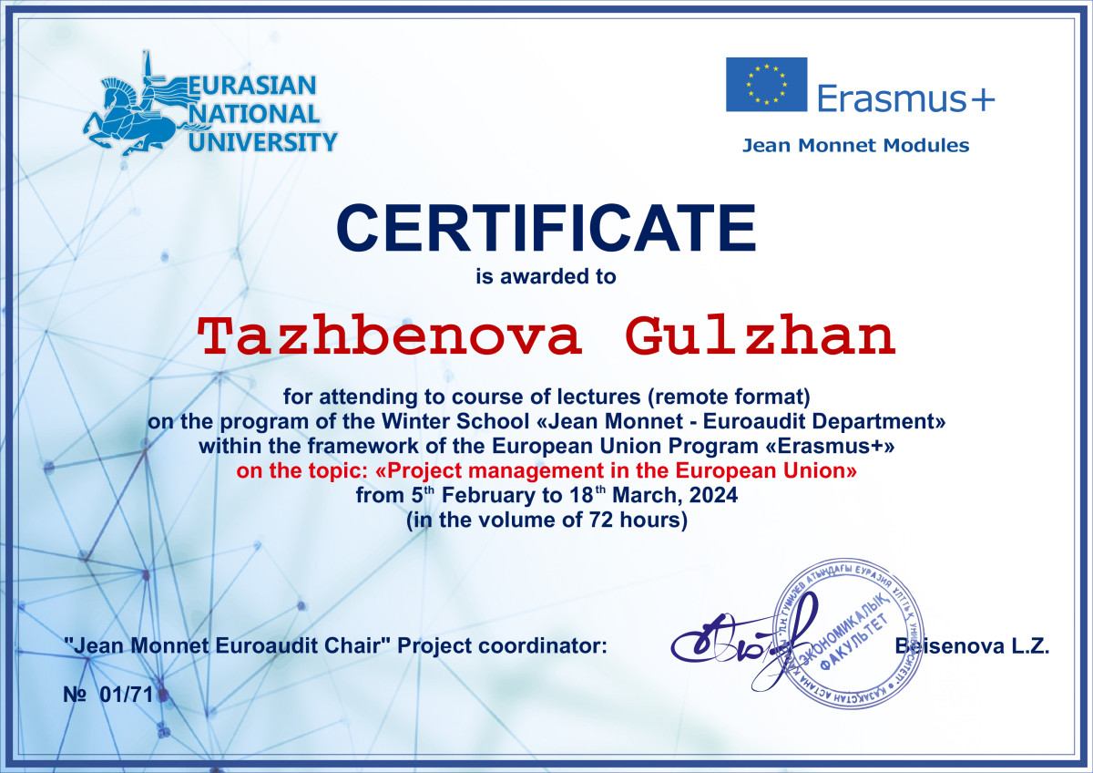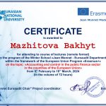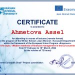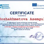 В период с 5 февраля по 18 марта 2024 года преподаватели кафедры экономических и математических дисциплин Тажбенова Г.Д., Мажитова Б.Б., Омарова Ш.А., Кожахметова А.Г., Ахметова А.А. прошли курсы повышения квалификации в объеме 72 часов в рамках программы обучения «Erasmus+» на базе НАО «Евразийский национальный университет им.Л.Н.Гумилева» на тему: «Project management in the European Union». Все участники курсов получили сертификаты.