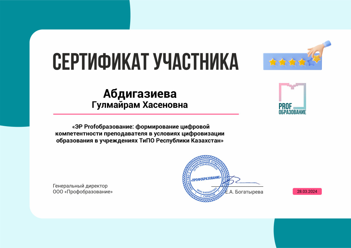28 марта 2024 года сотрудники библиотеки Евразийского гуманитарного института имени А.К.Кусаинова Абдигазиева Г.Х. и Молдашева Н.К. приняли участие в вебинаре «ЭР Profобразование: формирование цифровой компетентности преподавателя в условиях цифровизации образования в учреждениях ТиПО Республики Казахстан».