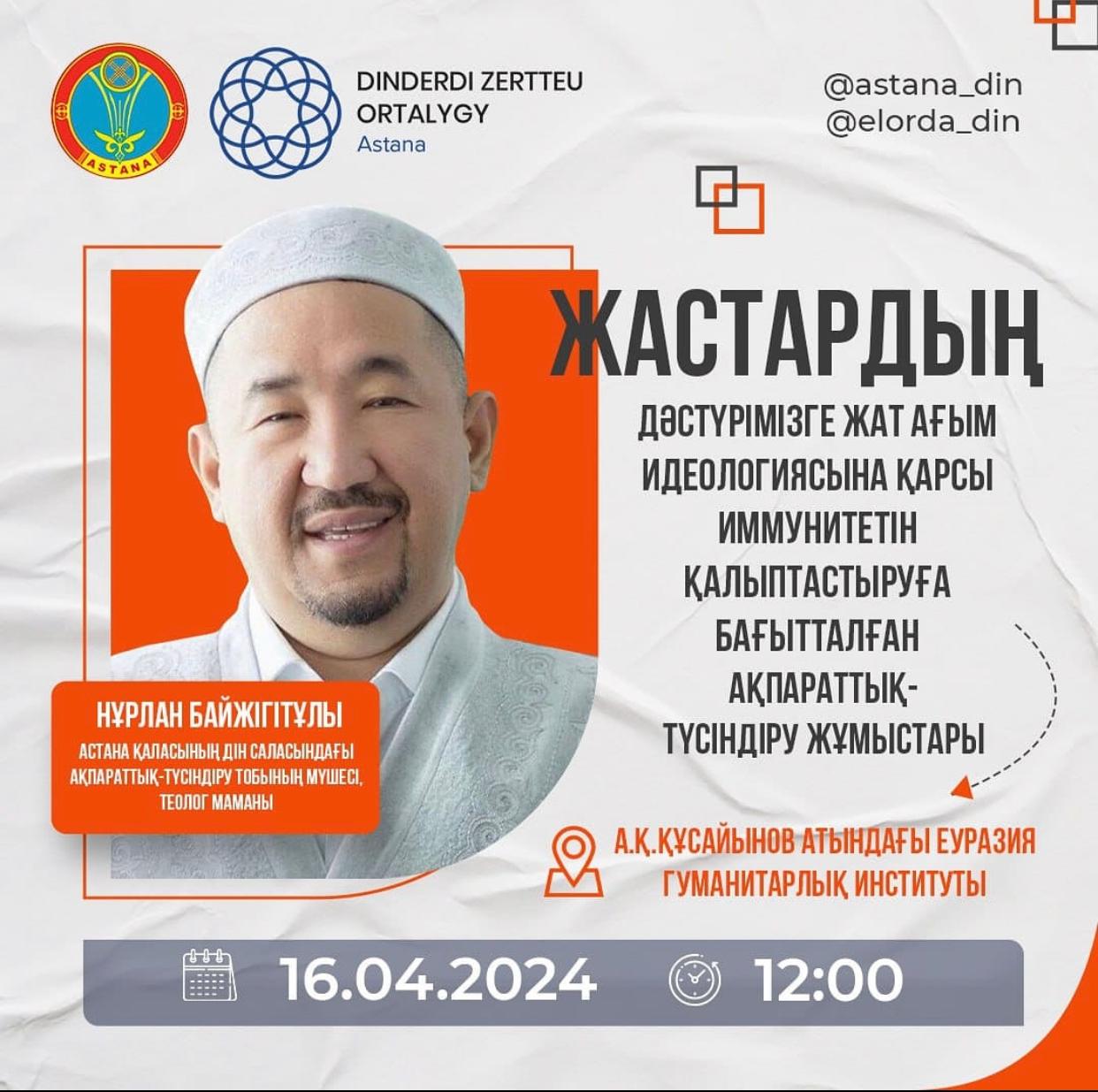 16 апреля 2024 года в Евразийском гуманитарном институте имени А.К. Кусаинова состоялась информационно – разъяснительная встреча нового формата представителей Центра изучения религий при поддержке Управления по делам религий: главного имама мечети Ырыскелді Қажы Асанова Нурлана Байжигитовича, лектора – теолога Центра изучения религий акимата г.Астаны Нурахметулы Армана со студентами института, направленная на формирование иммунитета молодежи к нетрадиционной идеологии.