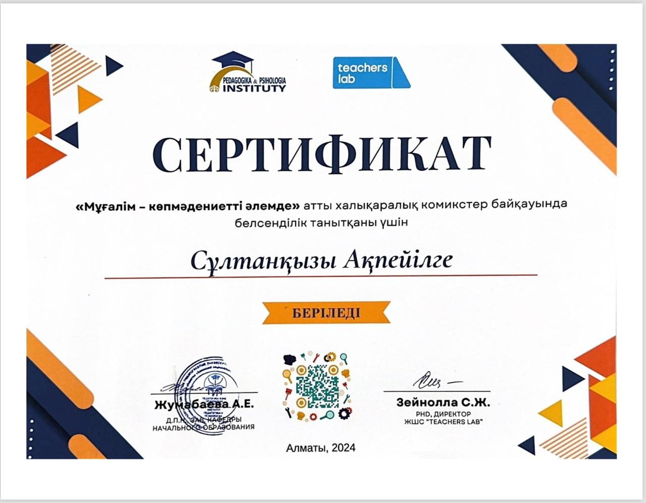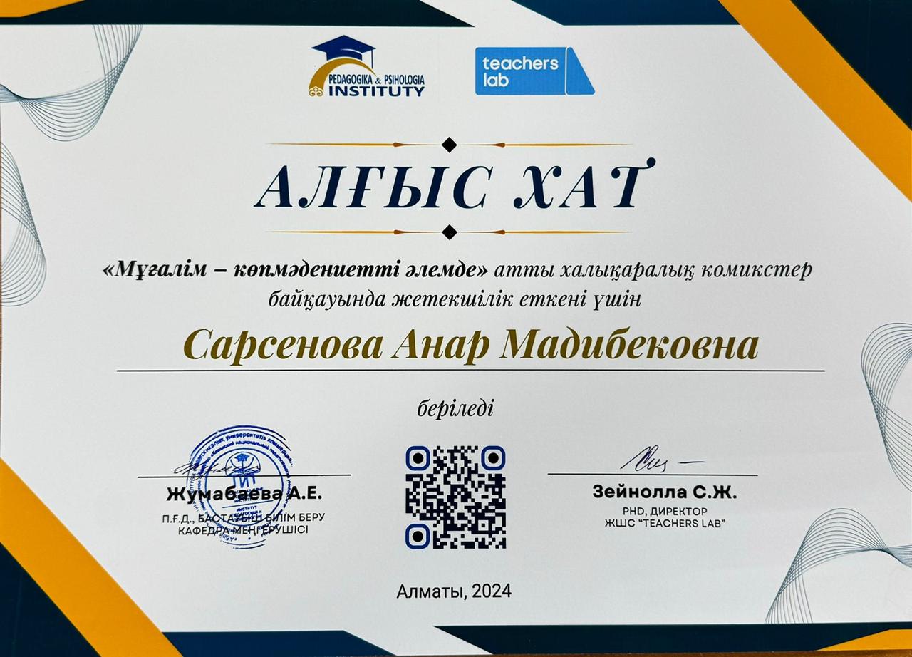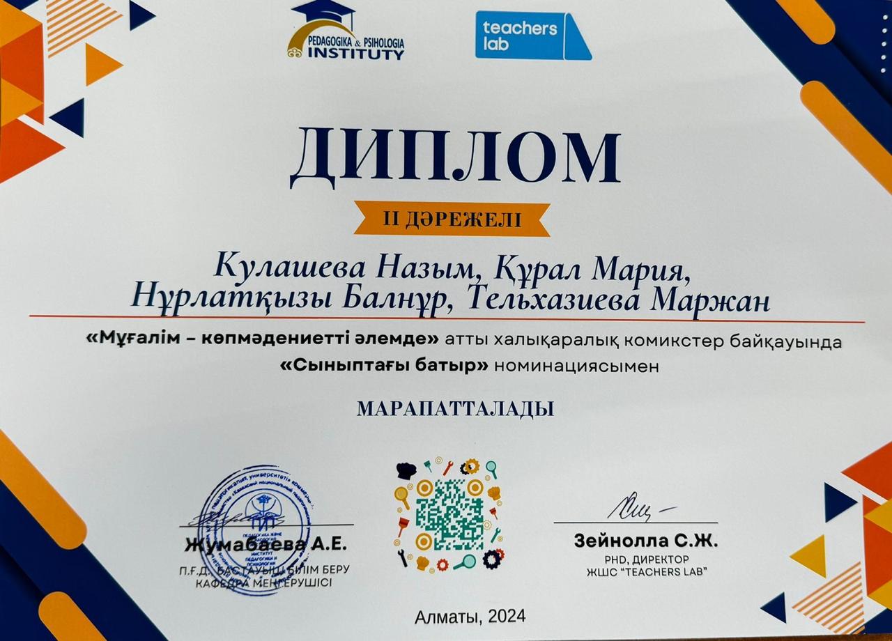 Студенты Кулашева Назым, Кұрал Мария, Нұрлатқызы Балнұр, Тельхазиева Маржан заняли 2 место в номинации «Герой в классе» (комиксы, где педагог является главным героем, вдохновляющим детей). Сұлтанқызы Ақпейіл отмечана сертификатом. Научный руководитель: старший преподаватель, м.п.н Сарсенова А.М .