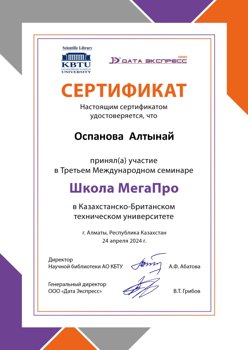 24 апреля 2024 года сотрудники библиотеки Евразийского гуманитарного института имени А.К.Кусаинова Абдигазиева Г.Х., Оспанова А.С., Молдашева Н.К. приняли участие в 3-м Международном семинаре Школы МегаПро, который прошел в Казахстанско-британском техническом университете (г. Алматы).