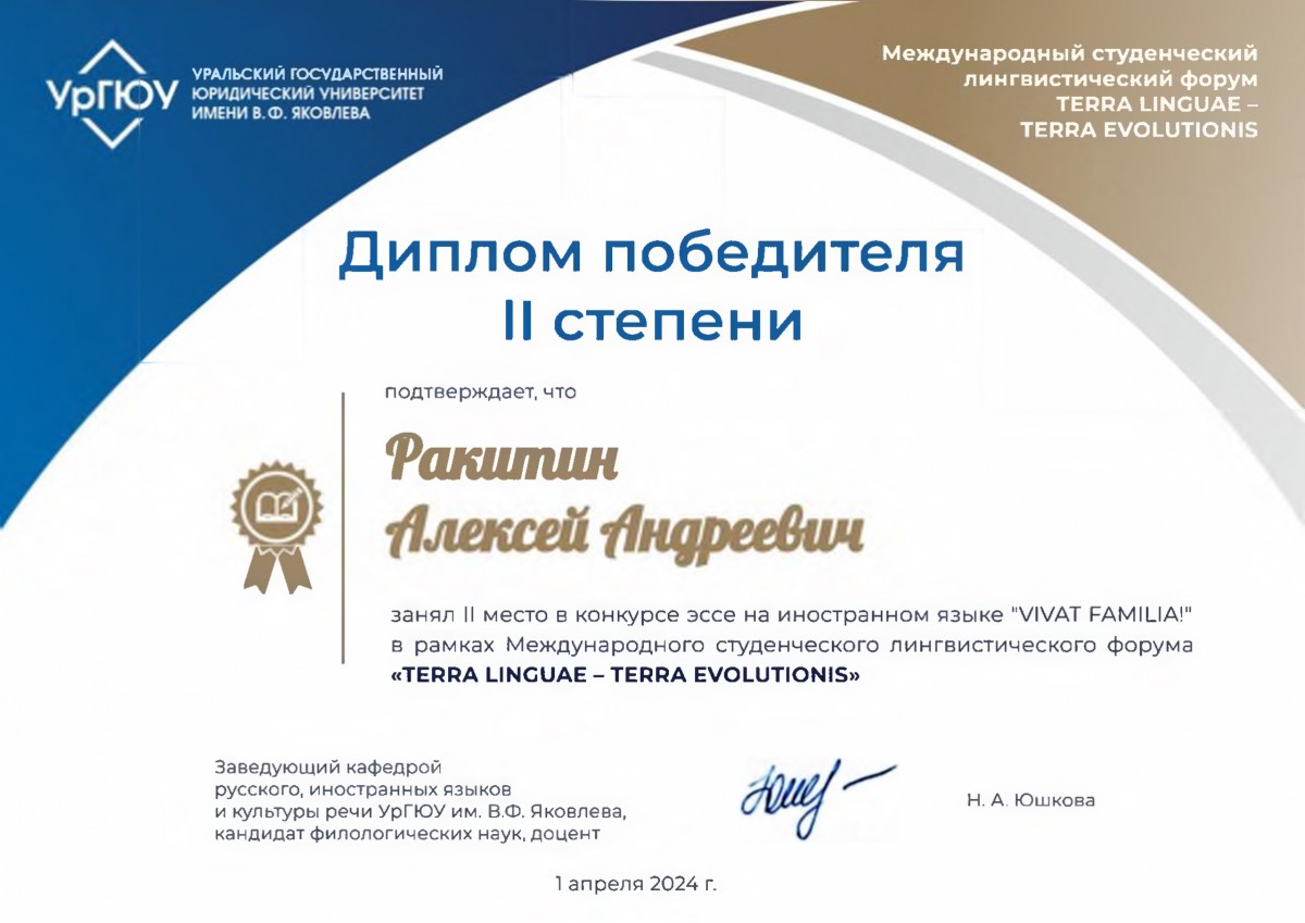 Студент Кенжаева Мафтуна (академическая группа ШТ-22-01) заняла 1 место в конкурсе эссе на иностранном языке, Ракитин Алексей (академическая группа ИЯ-23-01) занял 2 место в этом же конкурсе. Научный руководитель: старший преподаватель, м.п.н. Сарсенова А.М.