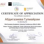 29 – 31 мая 2024 года сотрудники библиотеки Евразийского гуманитарного института имени А.К.Кусаинова Абдигазиева Г.Х., Оспанова А.С. приняли участие в 13-ой Евразийской конференции академических библиотек на тему: «Connect, Collaborate, Create: Advancing Library Associations and Partnerships to Future-Proof Our Profession», которая прошла на базе научной библиотеки Назарбаев университета. В рамках конференции ее участники обменялись информацией и опытом по актуальным вопросам библиотечного дела.