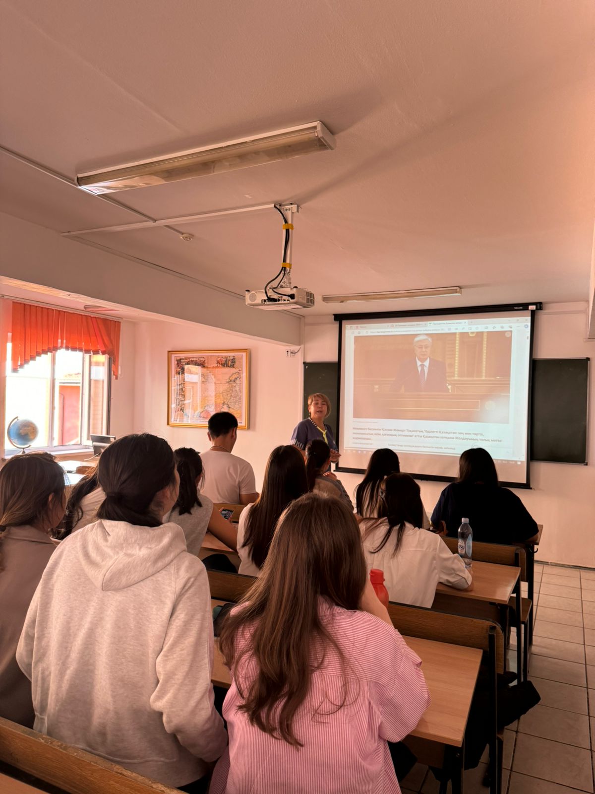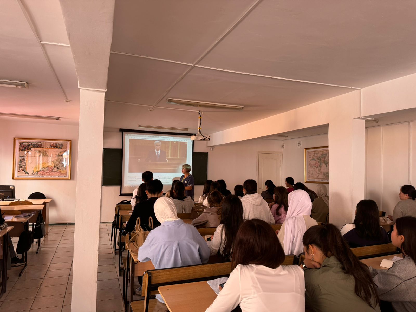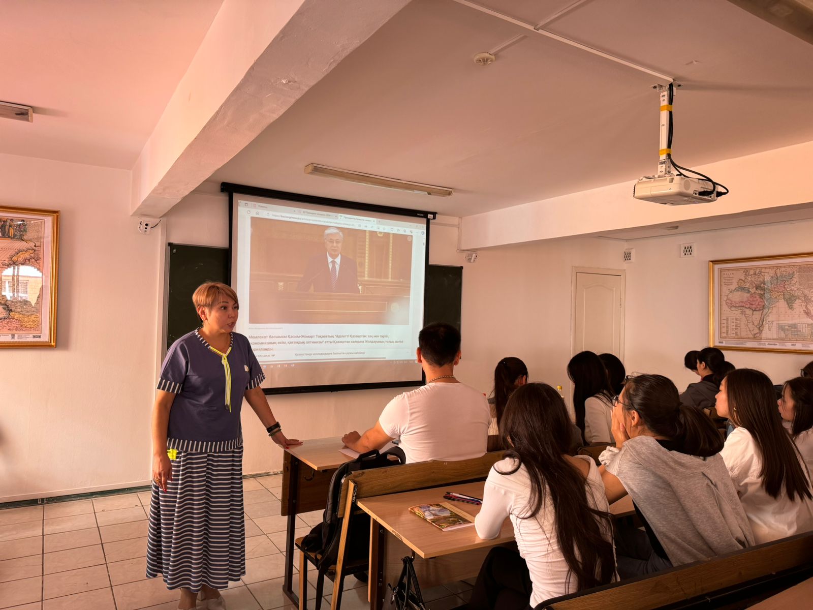 10 сентября 2024 года куратор Давлетова С.Е.  провела кураторский час в академической  группе ШТ-22-01 (3 курс, образовательная программа «Иностранный язык: два иностранных языка»), на котором обсудила со студентами Послание Президента  К.-Ж. Токаева,   с которым он обратился к народу Казахстана 2 сентября 2024 года. Куратор объяснила основные направления Послания и провела дискуссию со студентами по важным пунктам. В частности, были рассмотрены вопросы изменений в сфере образования, мер поддержки молодежи и цифровизации. Студенты задавали вопросы, связанные с Посланием, и делились своим мнением.