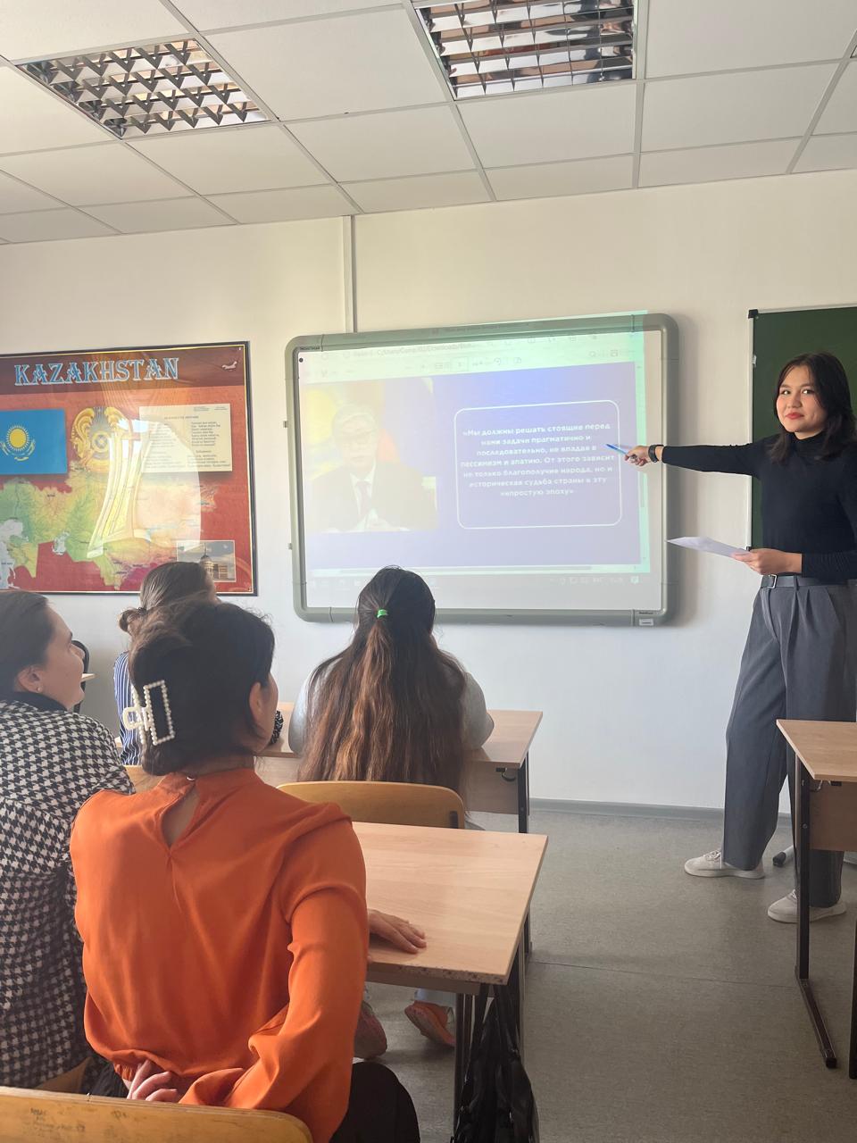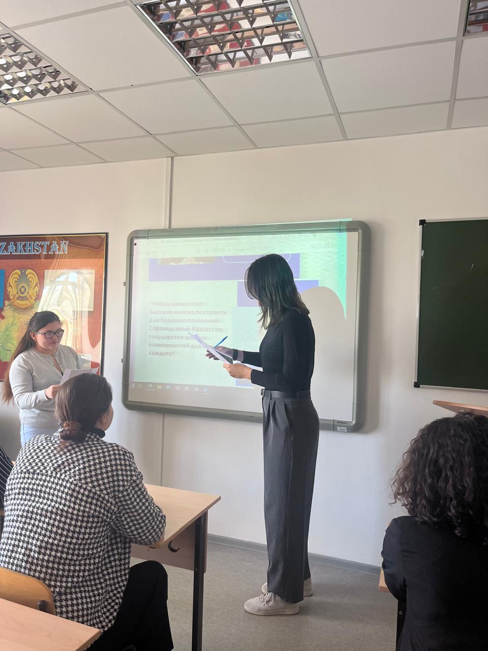 16 сентября 2024 года в академической группе ИЯТ-24-01 (1 курс, образовательная программа «Иностранный язык: два иностранных языка») прошел кураторский час под руководством куратора Марденовой Н.А. по обсуждению Послания Президента РК К.-Ж. К. Токаева  народу Казахстана.  Студенты группы  Капизова С.  и Тлеуканова К.  представили презентацию на обсуждаемую тему.