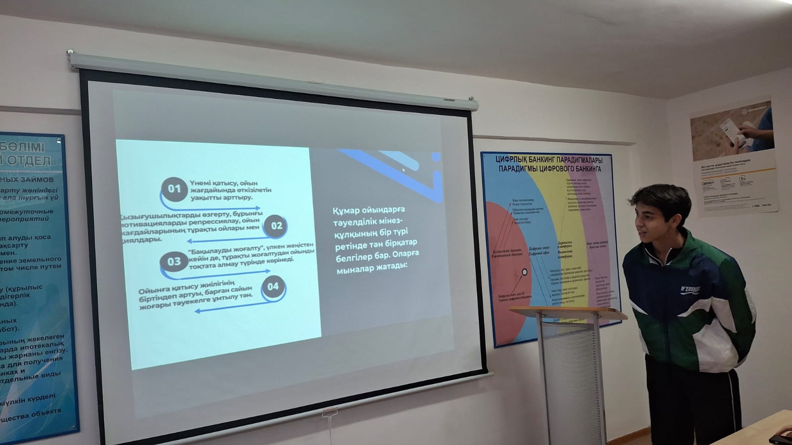 28 октября 2024 года старший преподаватель кафедры экономических и математических дисциплин Кожахметова А.Г. в интерактивном формате провела кураторский час в академических группах ҚЭТ-24-01, Қ-23-01, Қ-21-01 (1 – 4 курсы, образовательная программа «Финансы») на тему: «Лудомания – болезнь современного общества».