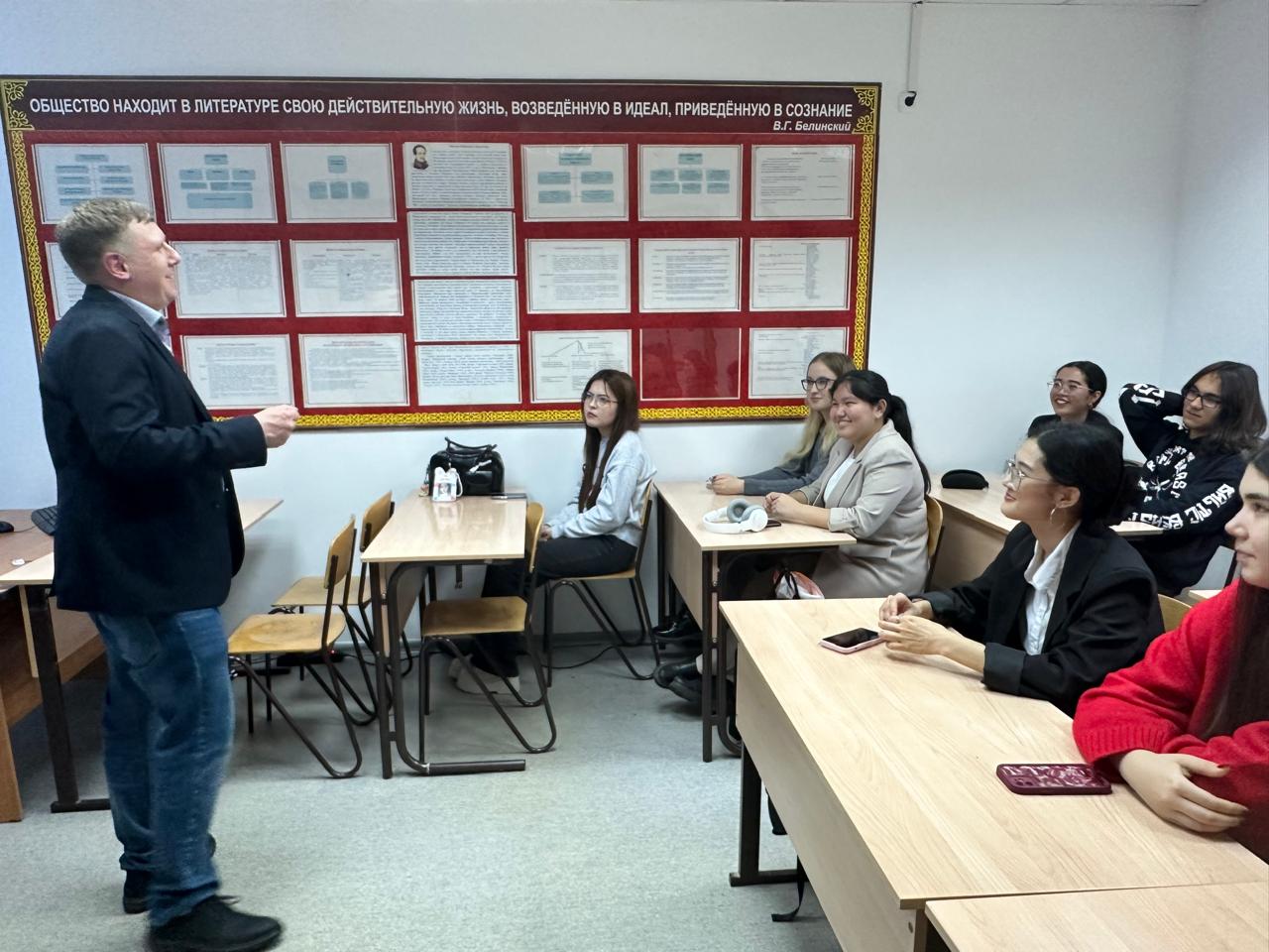 30 октября 2024 года на кафедре иностранных языков и переводческого дела прошла встреча студентов 2 – 3 курсов образовательной программы «Иностранный язык: два иностранных языка» (академические группы ИЯ-23-01, ШТ-22-02, ИЯ-22-01) с преподавателем английского языка, партнером американских программ «English for journalist » и «English for STEM», ведущим программы «Hello Kazakhstan» на канале Jibek Joly TV Nicholas Drapeau. Встреча вызвала теплый отклик у студентов, которые активно вовлеклись в диалог, задавая интересующие их вопросы.