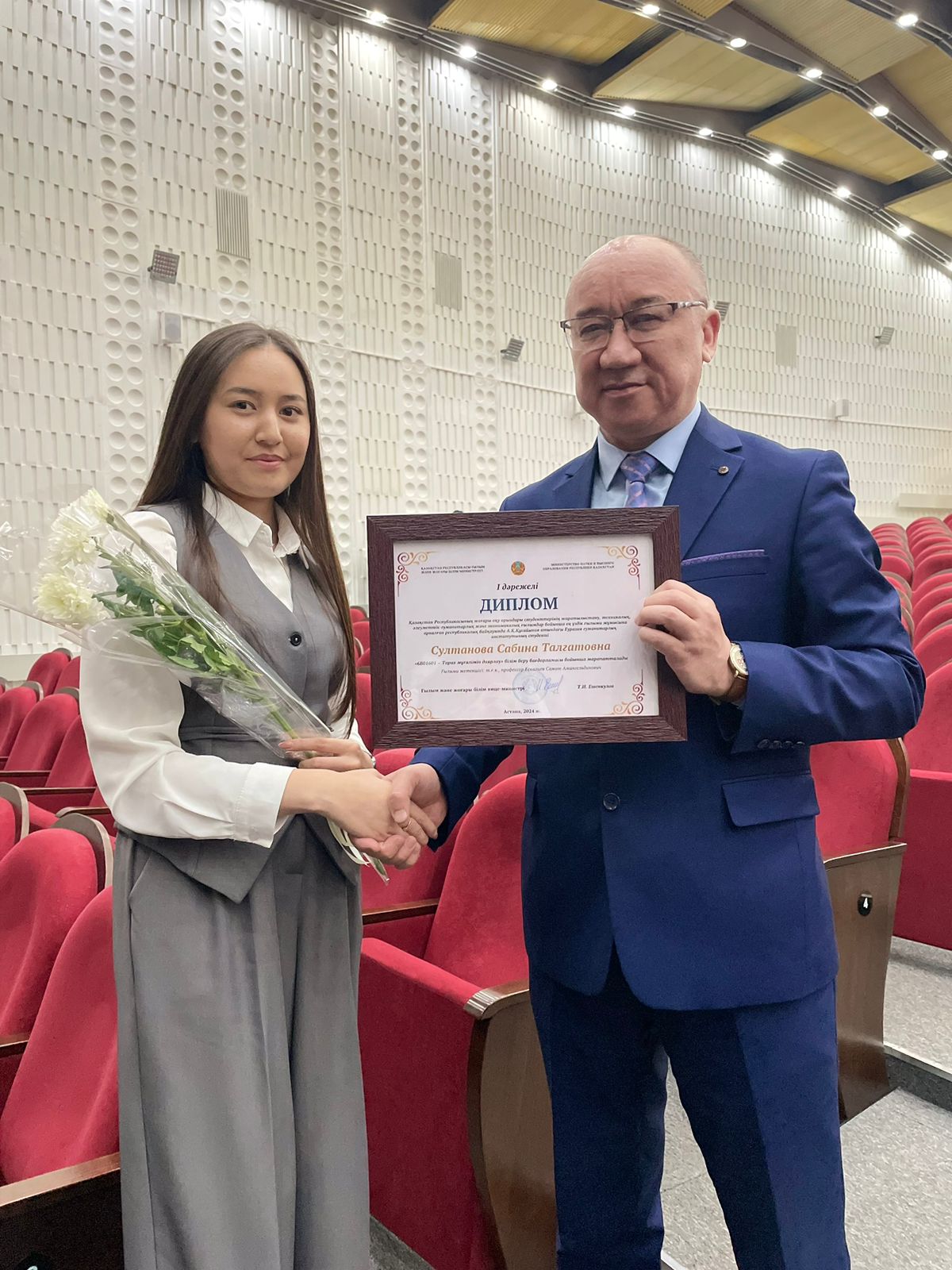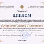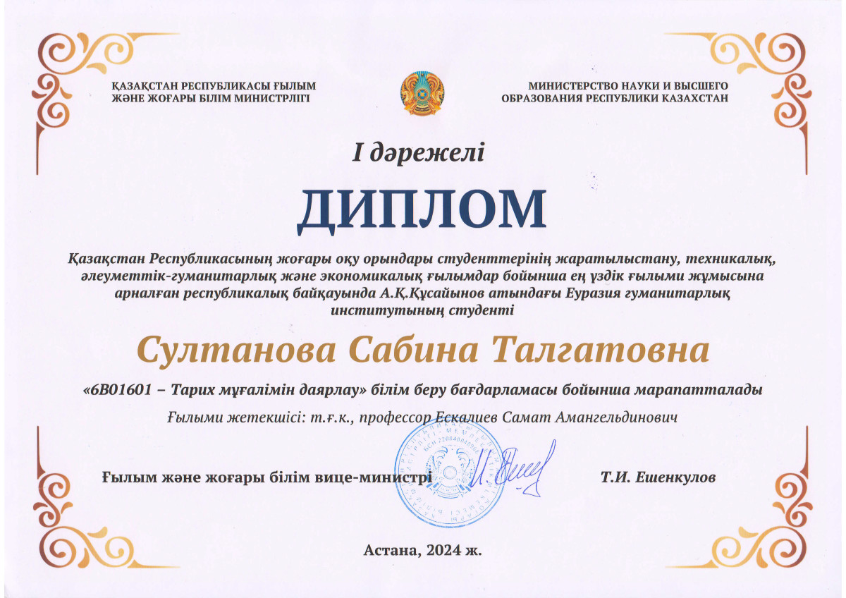 В республиканском конкурсе НИРС 2024 года, среди студентов высших учебных заведений Республики Казахстан по естественным, техническим, социально-гуманитарным и экономическим наукам, по образовательной программе «6В01601 – Подготовка учителей истории», почетное 1-место заняла студент академической группы Т-21-01, ОП «6В01606 – История» кафедры педагогики и истории Евразийского гуманитарного института имени А. К. Кусаинова Султанова С.Т. (научный руководитель: профессор, к.и.н. Ескалиев С.А.) Поздравляем!!!