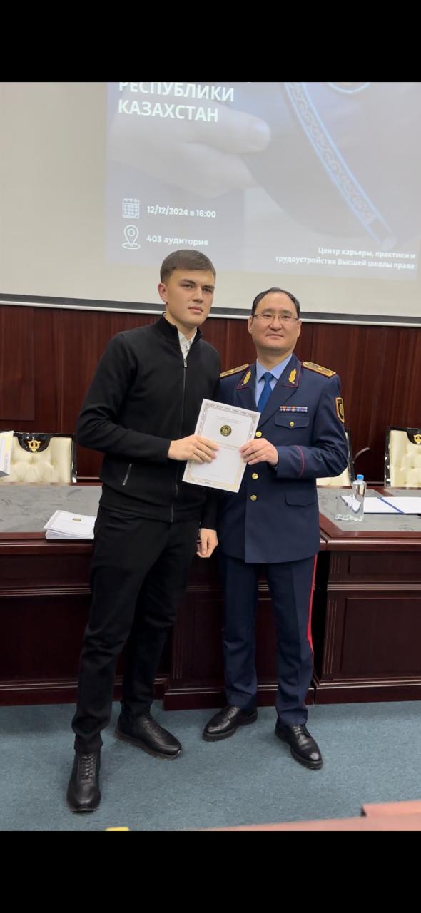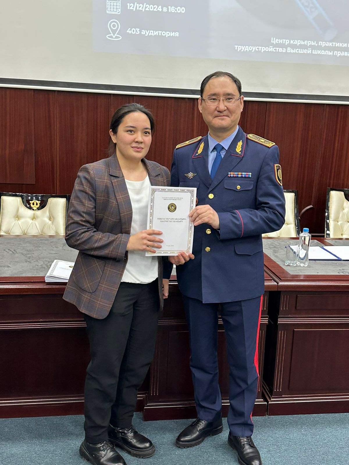 12 декабря 2024 года состоялась встреча студентов выпускных курсов юридических факультетов столичных вузов с руководством Министерства внутренних дел РК в лице вице-министра, генерал-майора полиции Адилова С.А., ведущими сотрудниками следственного департамента и департамента кадров МВД РК, а также представителями территориальных органов внутренних дел столицы. Сотрудниками следственного департамента и кадровой службы МВД РК была прочитана лекция о применении современных цифровых технологий в уголовном процессе, основных тенденциях и перспективах развития следственных подразделений в системе ОВД РК. Студенты получили ответы на многочисленные вопросы относительно порядка прохождения службы, основных направлений развития профессиональных компетенций следователя, а также совершенствования системы правоохранительных органов в современных условиях. Также в этот день в торжественной обстановке студенты 4-го курса образовательной программы «Юриспруденция» Евразийского гуманитарного института имени А.К.Кусаинова  Альжанов Мирас, Кустаубаева Томирис и Сайдалина Дильнара, прошедшие  конкурсный отбор среди лучших выпускников-юристов столичных вузов, из рук вице-министра внутренних дел РК, генерал-майора полиции Адилова С.А. получили именные приглашения на работу в органах внутренних дел.