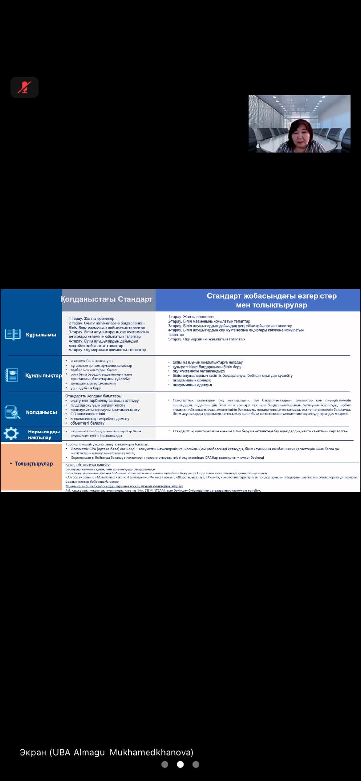 4 декабря 2024 года преподаватели кафедры педагогики и истории Евразийского гуманитарного института им. А.К.Кусаинова (Тобагабылова И.А., Балтабаева А.Т., Турманова Ж.Е., Еслямова А.З.) приняли участие в информационно-разъяснительном вебинаре, организованном Национальной академией образования им. Ы. Алтынсарина по проекту ГОСО дошкольного образования и обучения, начального, основного среднего, общего среднего, технического и профессионального, послесреднего образования.