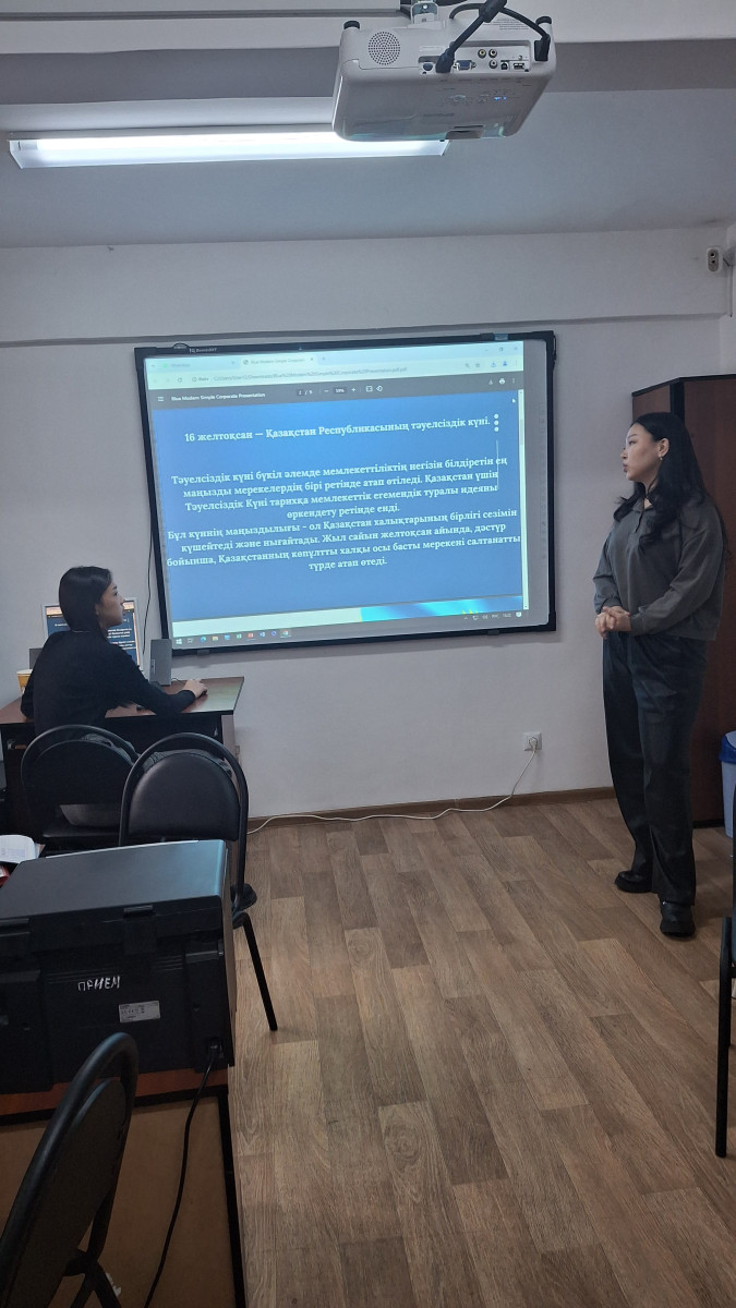 9 декабря 2024 года старший преподаватель кафедры экономических и математических дисциплин Кожахметова А.Г. провела кураторский час в академических группах ҚЭТ-24-01, Қ-23-01, Қ-21-01 (1, 2, 4 курсы, образовательная программа «Финансы»), посвященный Дню Независимости Республики Казахстан. Цель кураторского часа: воспитание патриотизма, знакомство с основными этапами становления независимости нашей страны. Студенты познакомились с историческими аудио- и видеоматериалы, а также просмотрели документальный фильм о событиях декабря 1986 года.