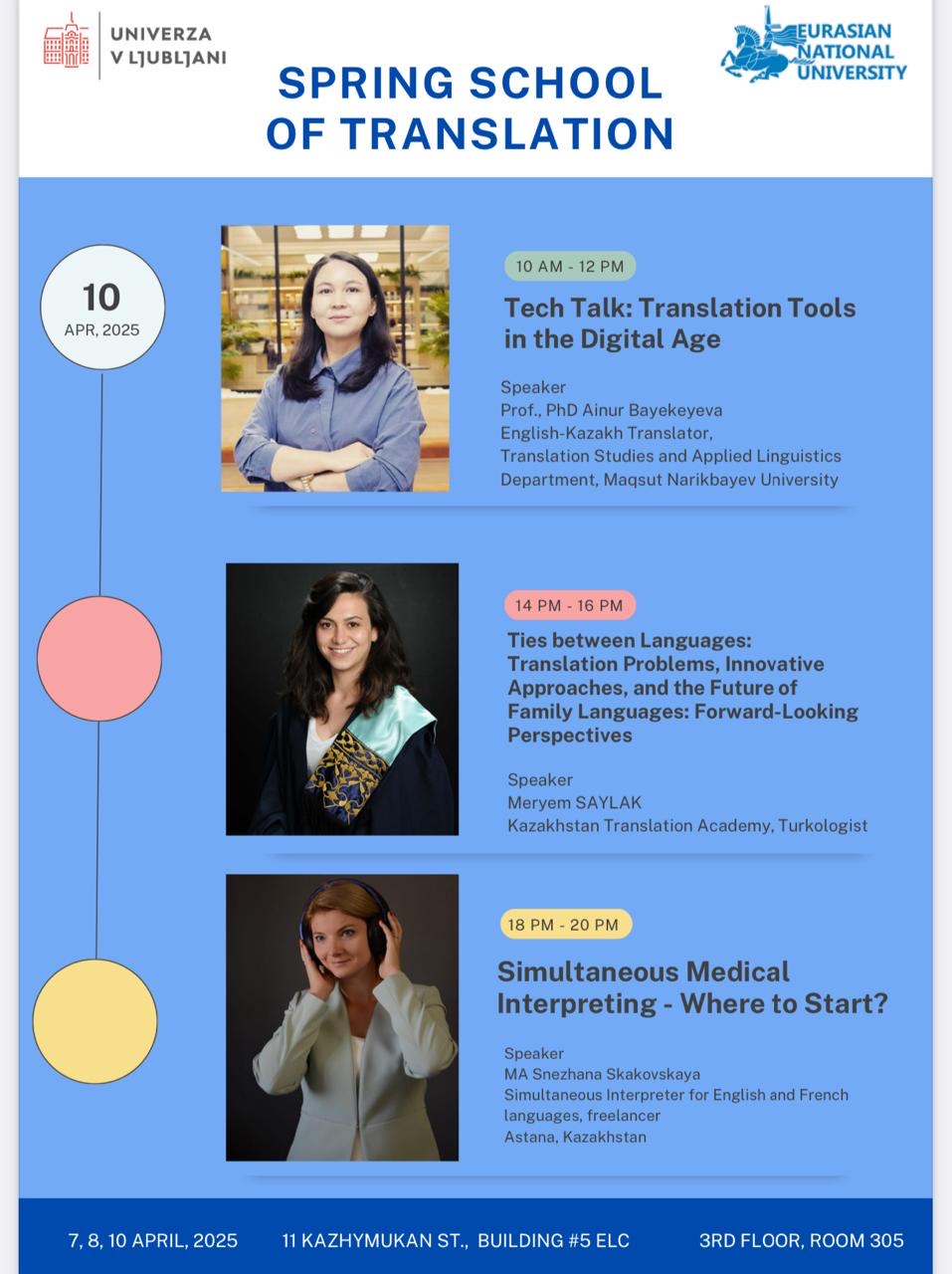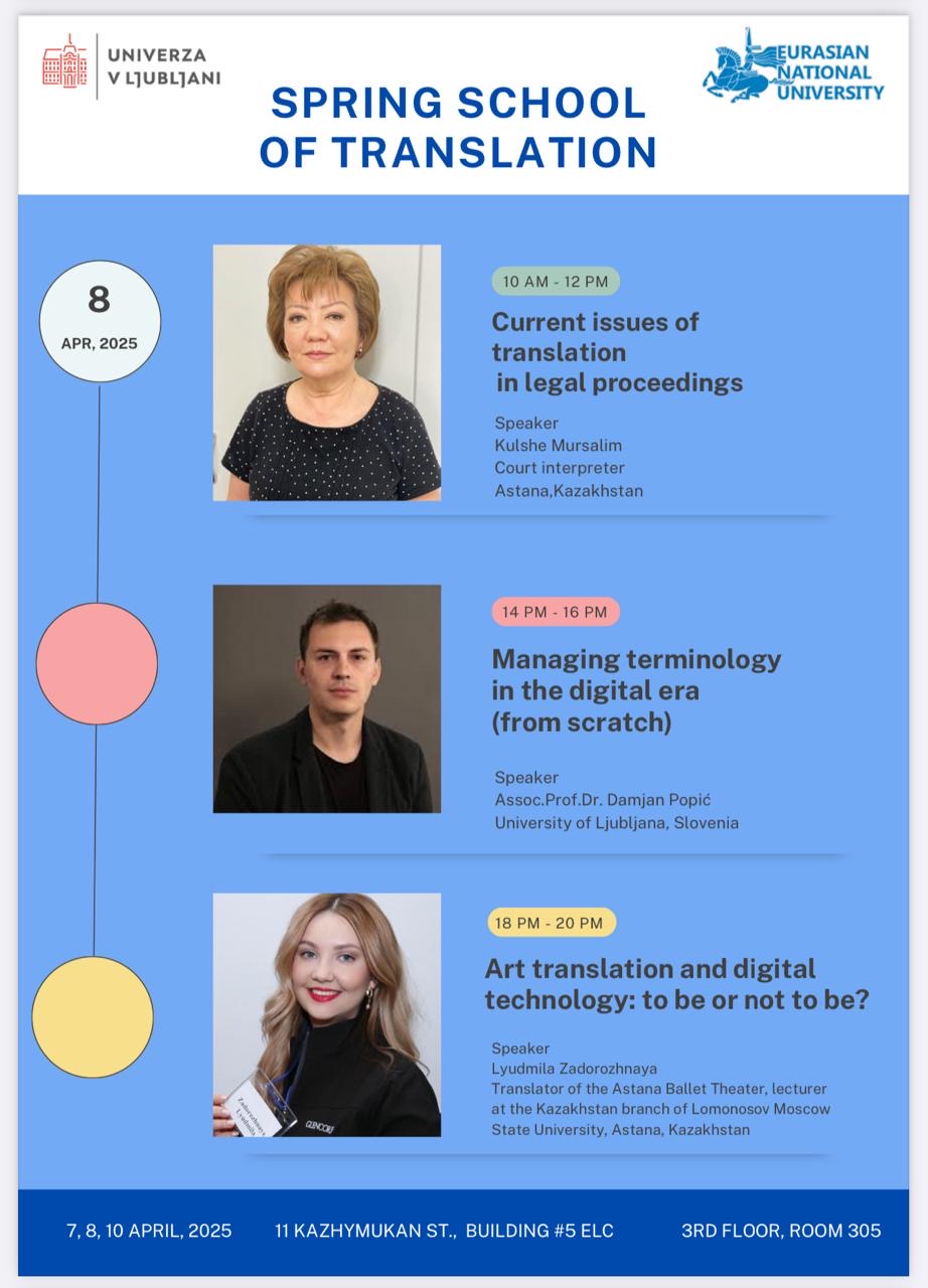 В период с 7 по 10 апреля 2025 года в гибридном формате (на английском языке) на базе Евразийского национального университета им. Л.Н.Гумилева (Казахстан) совместно с Люблянским университетом (Словения) была проведена Весенняя школа перевода (Spring School of Translation – 2025). На заседаниях Весенней школы в качестве лекторов выступили исследователи перевода и практикующие переводчики. Также в работе школы приняли участие студенты 2 – 3 курсов образовательных программ «Иностранный язык: два иностранных языка» и «Переводческое дело» Евразийского гуманитарного института имени А.К.Кусаинова (академические группы ИЯ-23-01, ШТ-22-02, АІ 22-01).