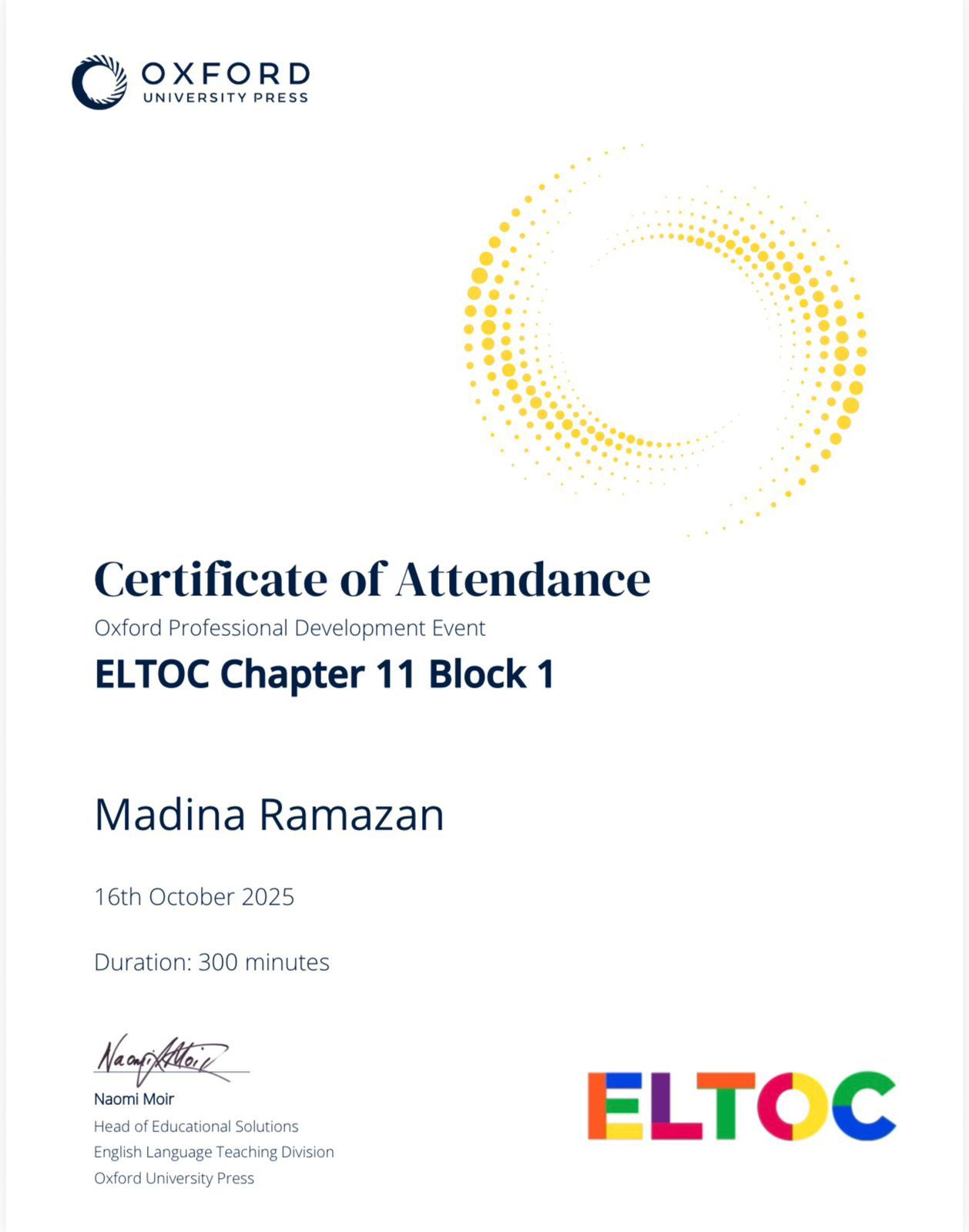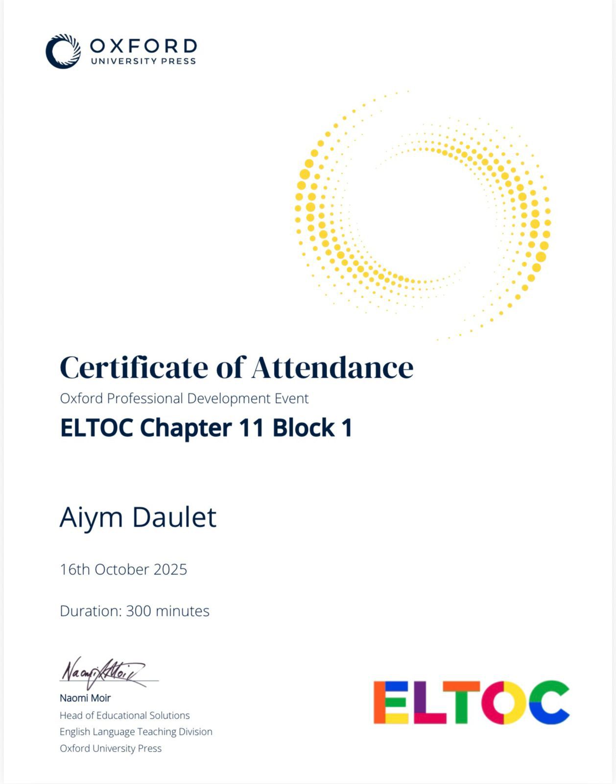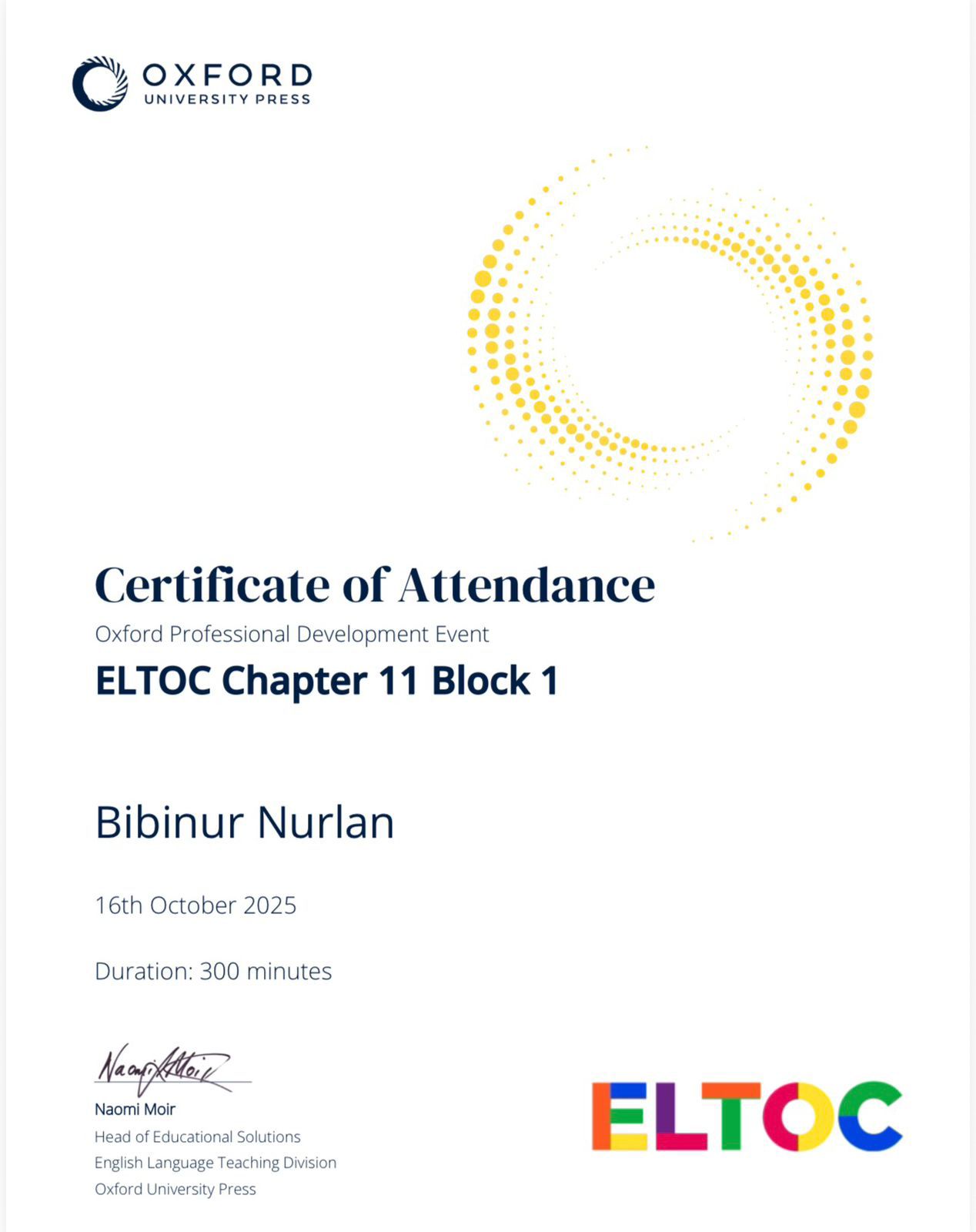 С 16 по 18 октября 2025 года студенты академических групп ШТ-23-02, ШТ-23-03 и ИЯ-23-01 (3 курс, образовательная программа «Иностранный язык: два иностранных языка») под руководством старших преподавателей кафедры иностранных языков и переводческого дела Сарсеновой А. М. и Темиргалиевой Г. К. приняли участие в международной онлайн-конференциив ELTOC (English Language Teaching Online Conference) Chapter 11, организованной издательством Oxford University Press.
