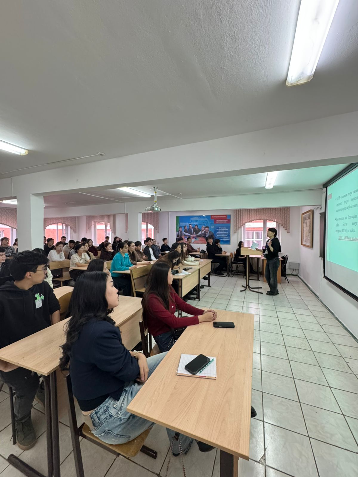 Жанна Қуанышқызы Бекетова, эпидемиолог Центра профилактики ВИЧ-инфекции, выступила с лекцией на тему: «Профилактика ВИЧ-инфекции». Студентам рассказали о путях передачи ВИЧ-инфекции, методах защиты, необходимости регулярного обследования, экспресс-тестах и важности ответственного отношения к своему здоровью.