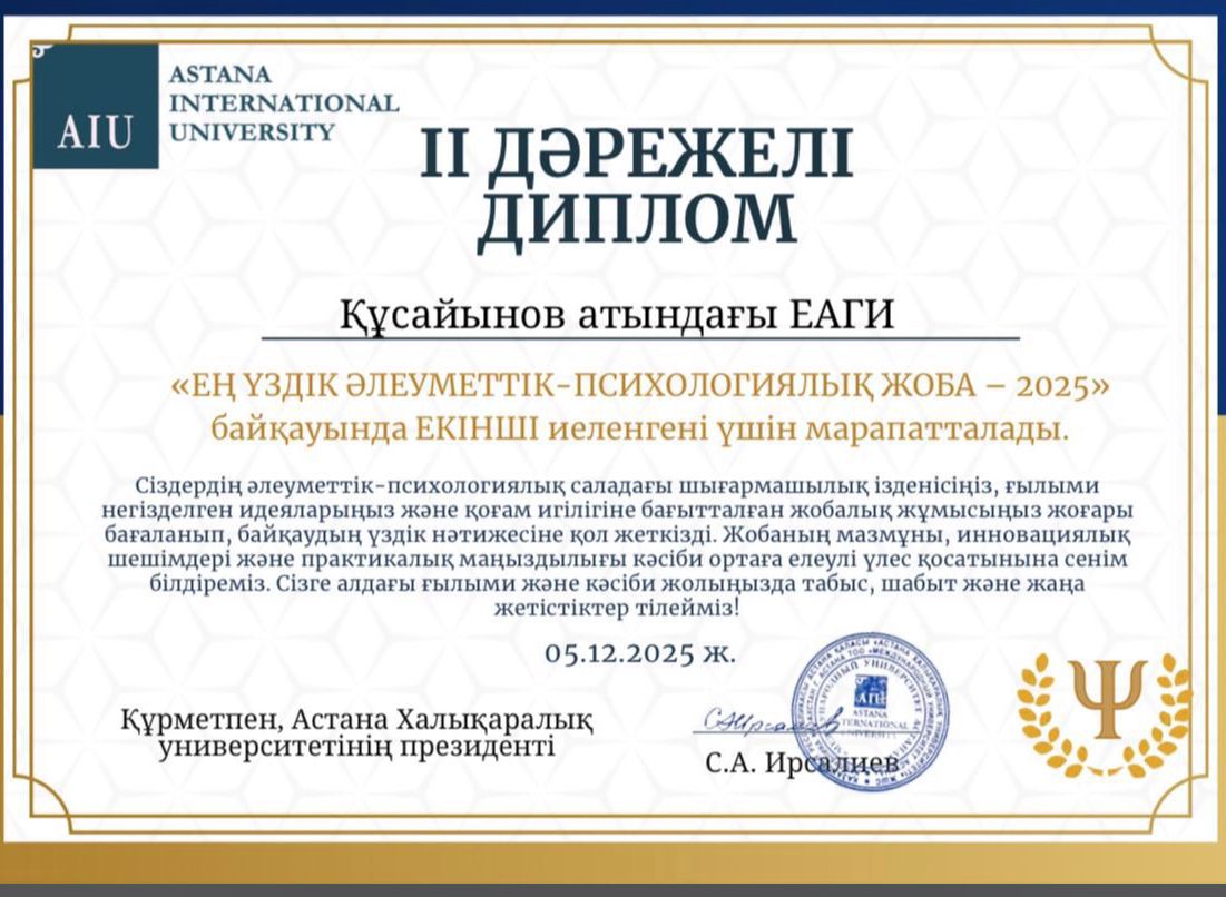 5 декабря 2025 года на республиканском конкурсе «Лучший социально-психологический проект-2025», организованном Международным университетом Астана, студенты 2 курса образовательной программы «Педагогика и психология» Хамитова Айым, Усербекова Махаббат, Хамраева Динора (научный руководитель: доцент Аязбаева А.Т.) получили диплом II степени; студент 3 курса образовательной программы «Педагогика и психология» Аманова Нурасем (научный руководитель: доцент Турманова Ж.Е.) получила диплом III степени.