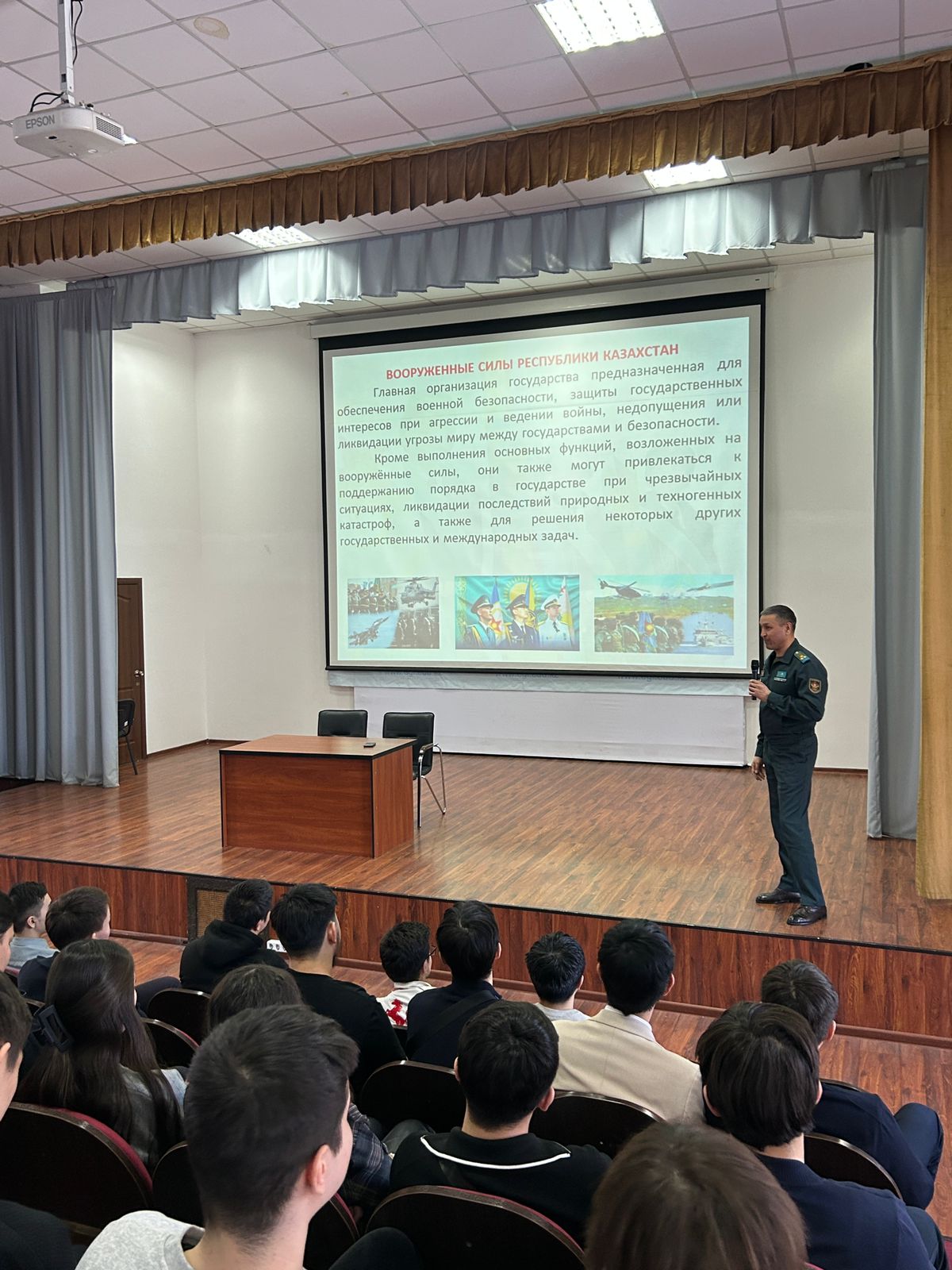 Спикерами встречи выступили полковник Абдуллаев А.С. и полковник Шокпутов А.А. Они подробно рассказали о сроках приёма документов, порядке подачи заявлений, условиях оплаты, а также о формате вступительных экзаменов и требованиях к кандидатам. Студенты получили исчерпывающие ответы на свои вопросы и чёткое представление об этапах поступления.