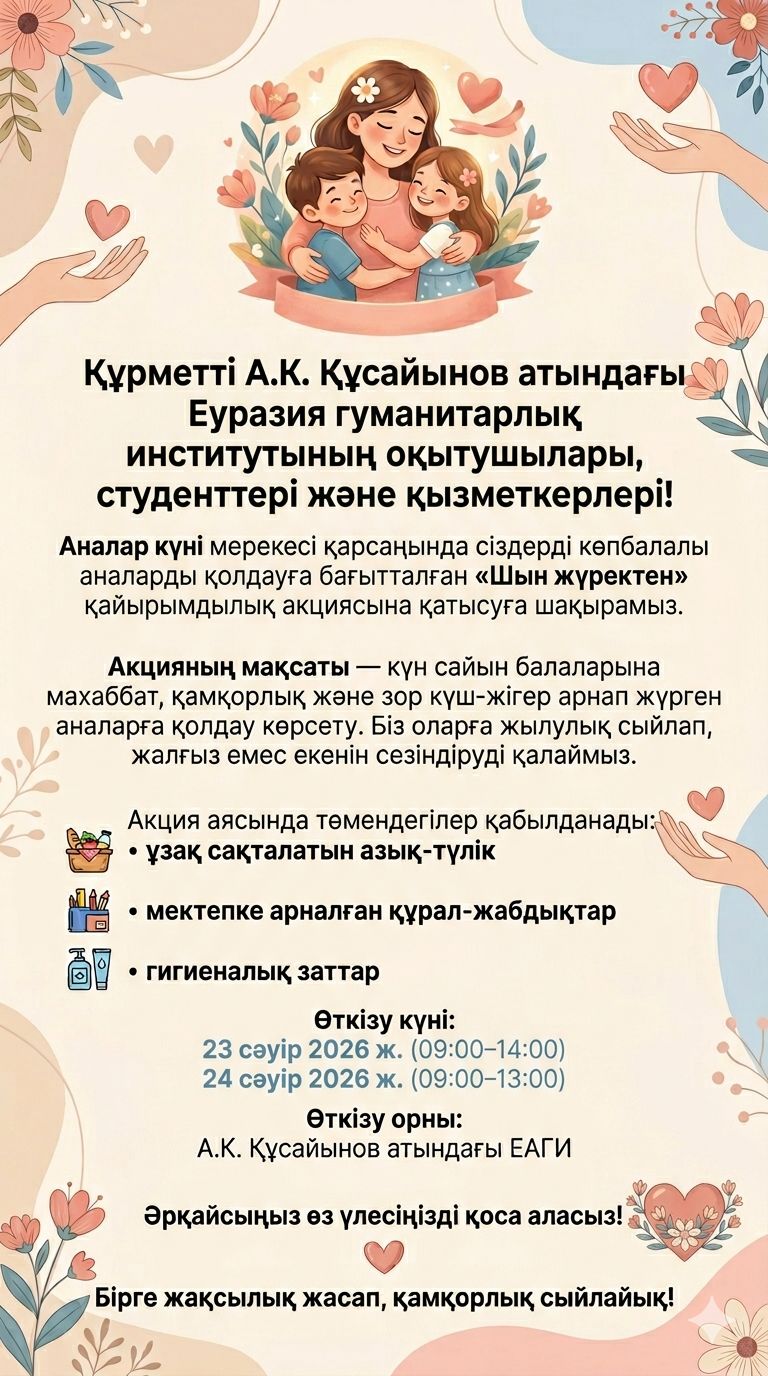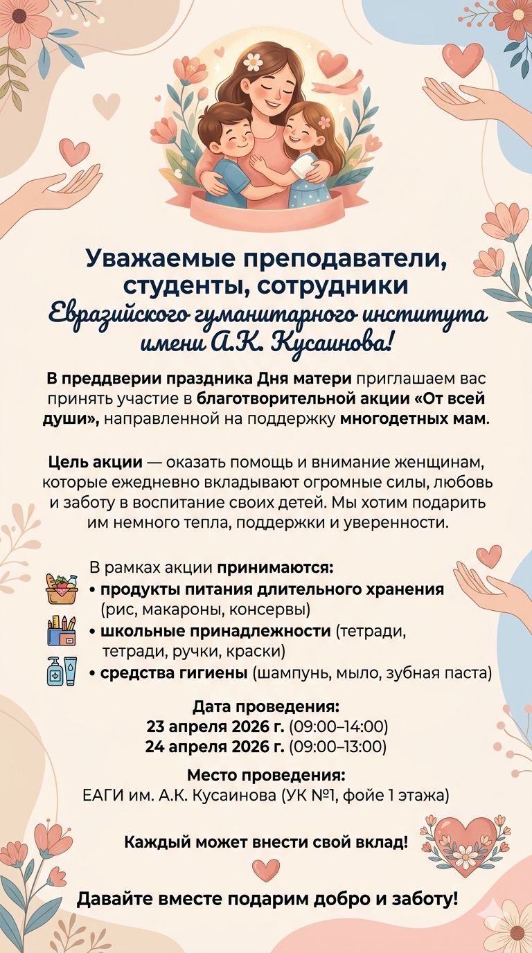 В преддверии Дня матери в Евразийском гуманитарном институте имени А.К. Кусаинова стартует добрая и важная инициатива — благотворительная акция «От всей души»!