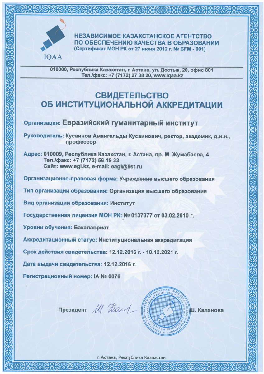 Решением заседания Аккредитационного совета Независимого агентства по обеспечению качества в образовании (IQAA) от 28 мая 2022 года Евразийский гуманитарный институт признан прошедшим программную аккредитацию сроком на 5 лет.