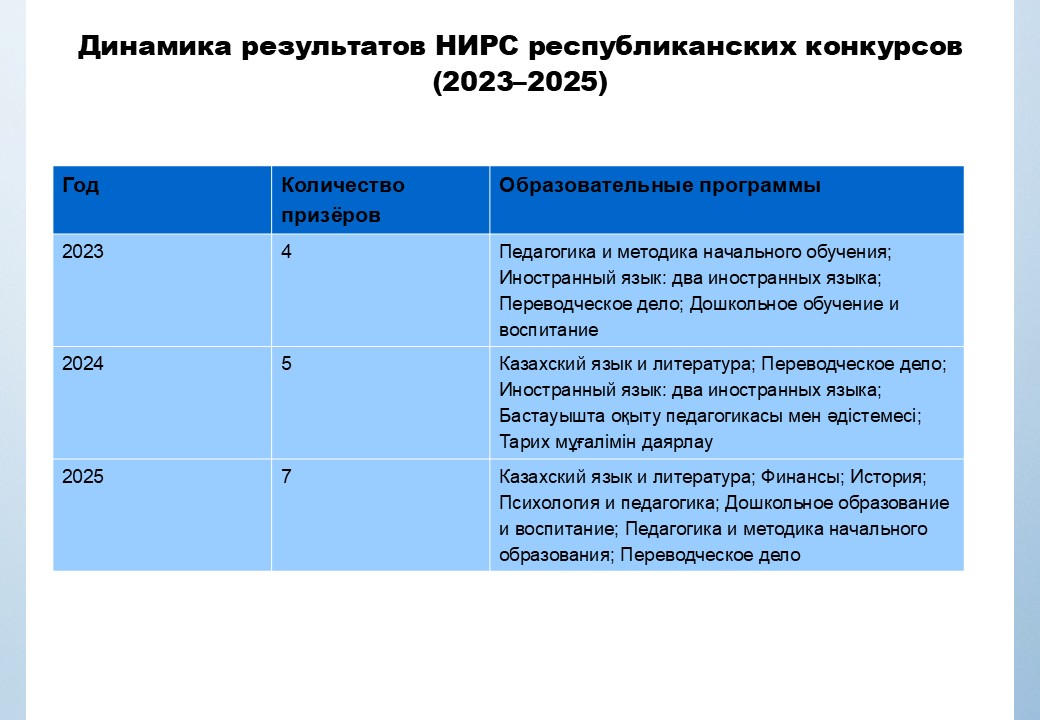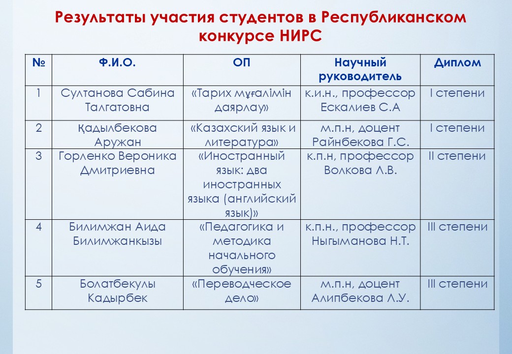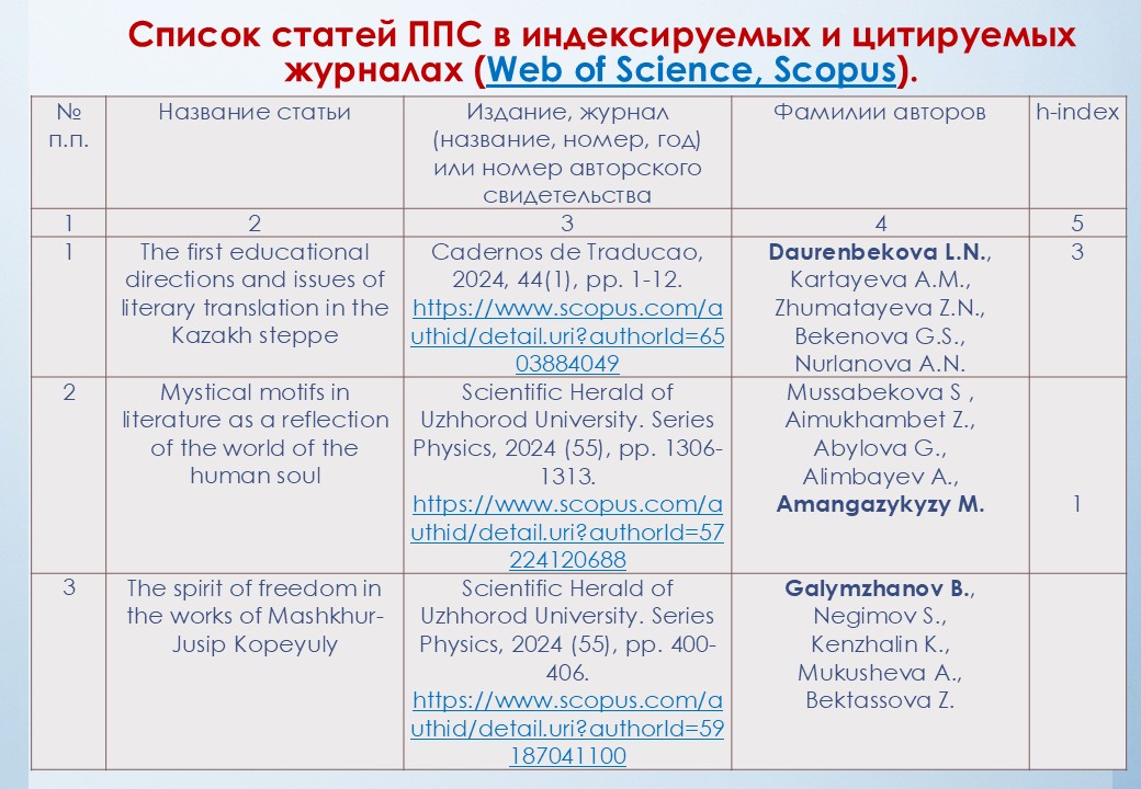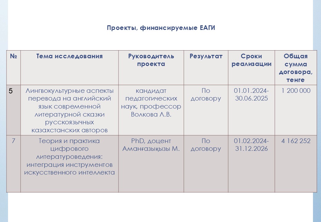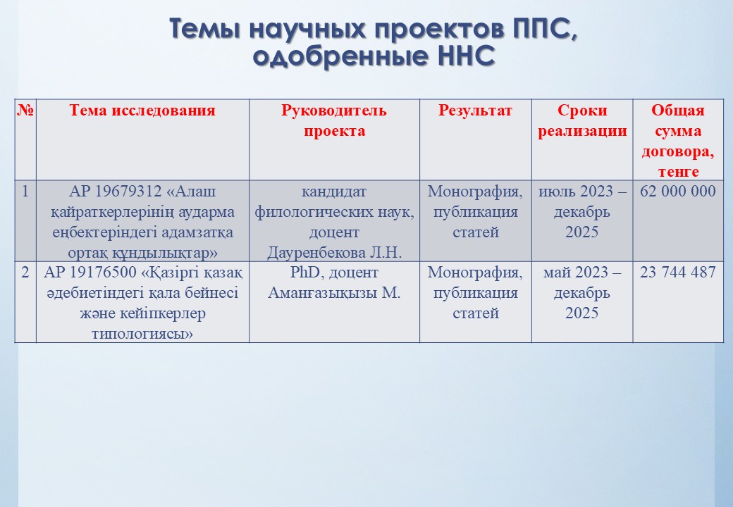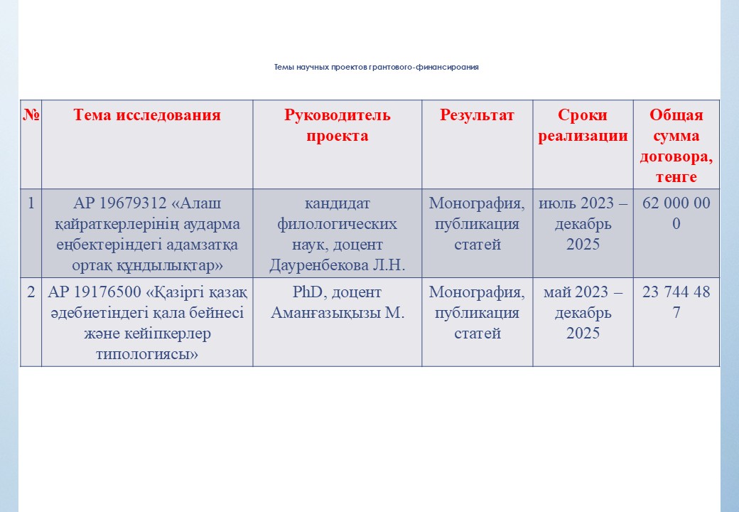 - «Теоретические и методические проблемы казахского языка и литературы» (руководитель темы: профессор Бекенова Г.Ш., доцент Дауренбекова Л.Н.).