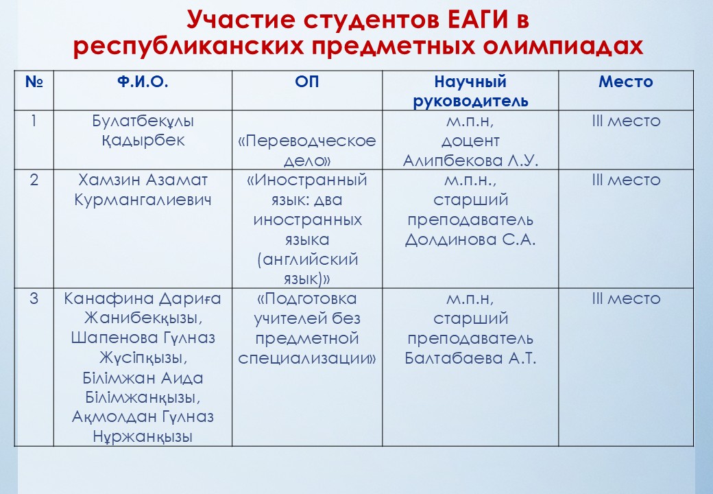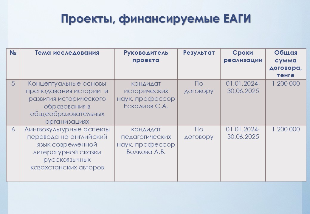 - «Теоретико-методологические основы комплексного подхода: обучение иностранным языкам, лингводидактика и переводоведение» под руководством к.п.н, профессора Мейрамовой С.А.