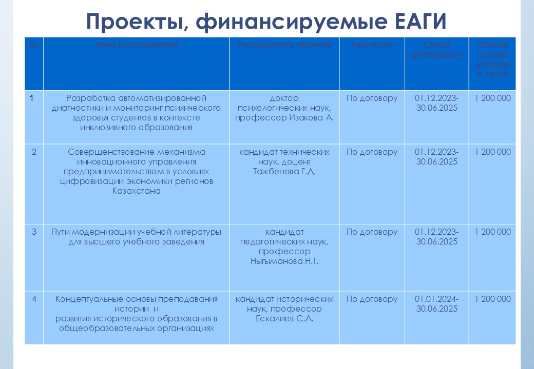 - «Социально-экономические процессы: состояние и тенденции развития современного Казахстана» (руководитель темы: кандидат технических наук, доцент Тажбенова Г.Д.);