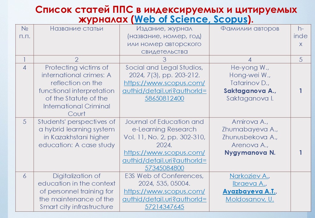 - «Соотношение национального законодательства и международно-правовых норм» (руководитель – к.ю.н., профессор Идрисов К.З., соруководитель – к.ю.н., доцент Альмухамбетов Ж.Н.).
